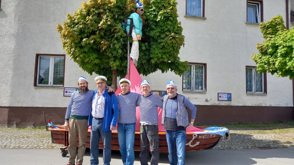 Die Idee zu dem ungewöhnlichen Bootsausflug hatte der ehemalige Fußballer Jens Schulze. Gemeinsam mit einigen Freunden machte er das Boot am ehemaligen Wärmegerätewerk in Elsterberg flott. Ausgestattet mit einem drei Meter hohen Mast, Segeln und dem „Schiffsarzt“ im Ausguck wurde das Gefährt nicht in der Elster zu Wasser gelassen, sondern auf einem Aufleger montiert auf die Straße bugsiert. Und so ging es auf die rund 20 Kilometer lange Tour. Natürlich wurde mehrfach Station gemacht. So erfrischte sich die Bootscrew mit Gerstensaft im Gasthof Noßwitz, in der „Eiche“ in Dölau, in der Alten Papierfabrik Greiz, am Schützenhaus in der Gartenanlage „Flügerad“ und im „CityLife“ am Greizer Röhrenbrunnen. Natürlich wurde hier und da auch etwas feste Nahrung aufgenommen. In der Waldstraße frischte die Bootsbesatzung ihr Proviant am fliegenden Verkaufsstand zweier Mädchen auf. Denn der schwerste Tagesabschnitt lag noch vor der Gruppe: Das Boot musste über Untergrochlitz hinauf nach Moschwitz gezogen und geschoben werden. Auch das bewältigten die Männer mit einiger Anstrengung, so dass es über die Wüstenteichstraße und den Stern in Erbengrün zu einer Gartenanlage in Naitschau ging. Hier liegt das Boot im Garten von Jens Schulze nun vor Anker.