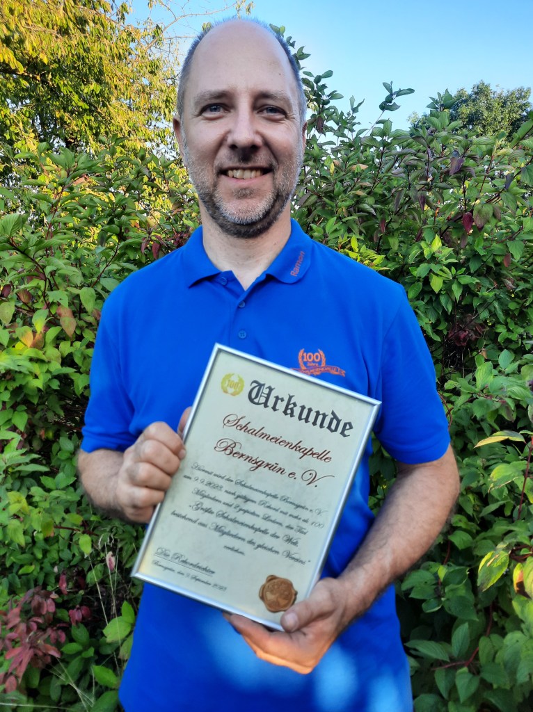 Foto 2: Ramon Riedel, der Macher des Rekordversuchs, hat gut lachen. Er wurde am Ende für seinen großen Einsatz und Engagement nicht nur mit Erfolg belohnt, sondern bescherte auch der Kapelle das schönste Geburtstagsgeschenk. So ähnlich könnte die Urkunde über den gültigen Rekord aussehen, die vom Institut Deutschland erstellt wird.