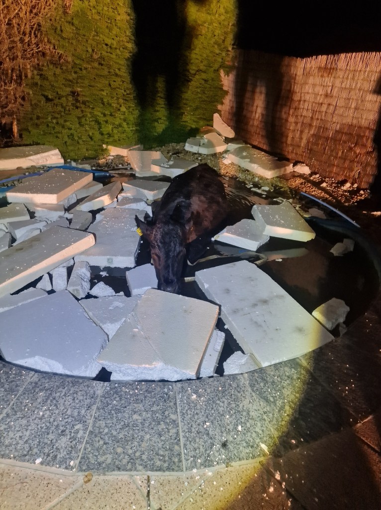 Der Pool wurde durch die Aktion stark beschädigt, aber die Besitzer konnten trotzdem noch darüber lachen. Kleine Hinterlassenschaften zum doch recht kuriosen Geschehen ließ die Kuh im Hof zurück.