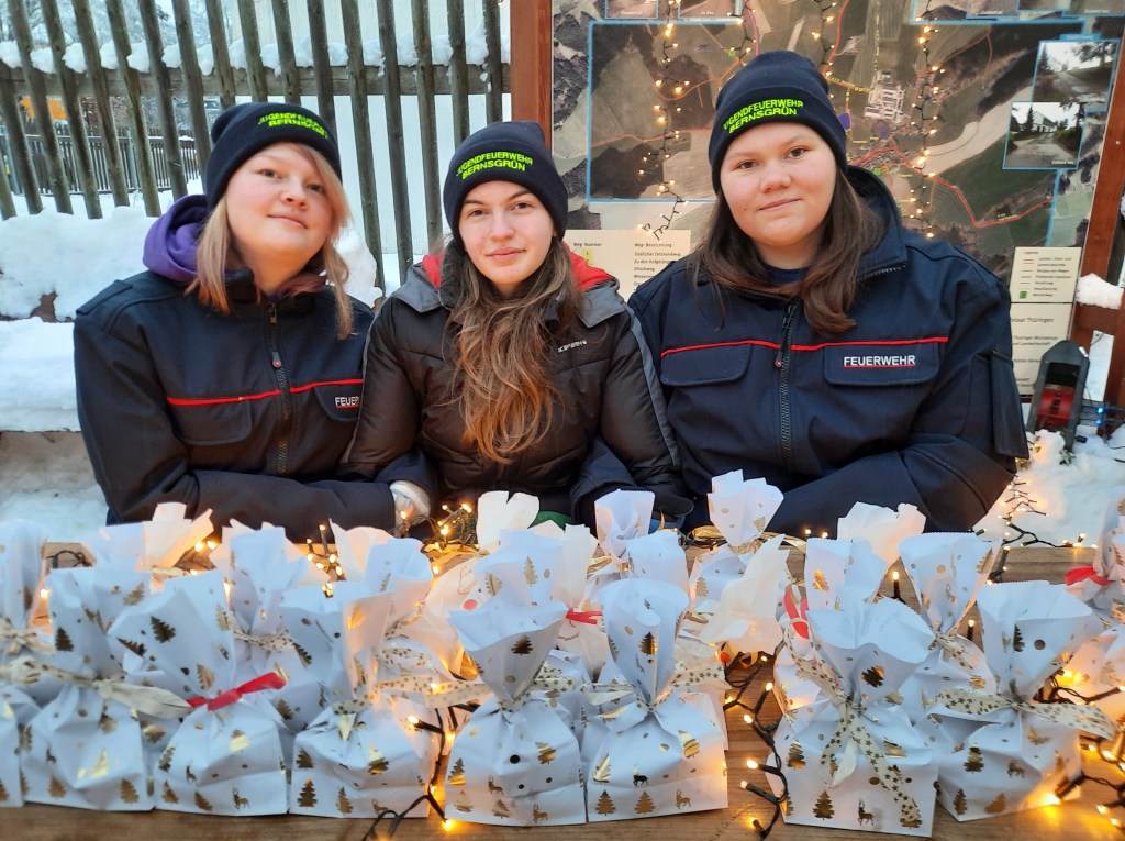 Besonders aktiv an diesem späten Nachmittag war auch die Jugendfeuerwehr. Sie sorgten durch das Beräumen des Platzes von Schnee vor dem Feuerwehrhaus für Sicherheit, und sie präsentierten auch wieder ihren neu dekorierten Leuchtcube vor dem Feuerwehrhaus. Im Vorfeld setzten sie außerdem eine tolle Idee in die Tat um. Plätzchenduft lag in der Feuerwehrküche in der Luft, denn die älteren Mitglieder hatten Plätzchen gebacken und ansprechend verziert. Diese boten sie allen Gästen gegen eine frei gewählte Spende für die Jugendfeuerwehr an, was auch gut ankam.