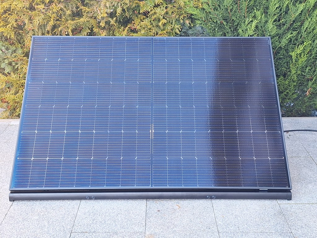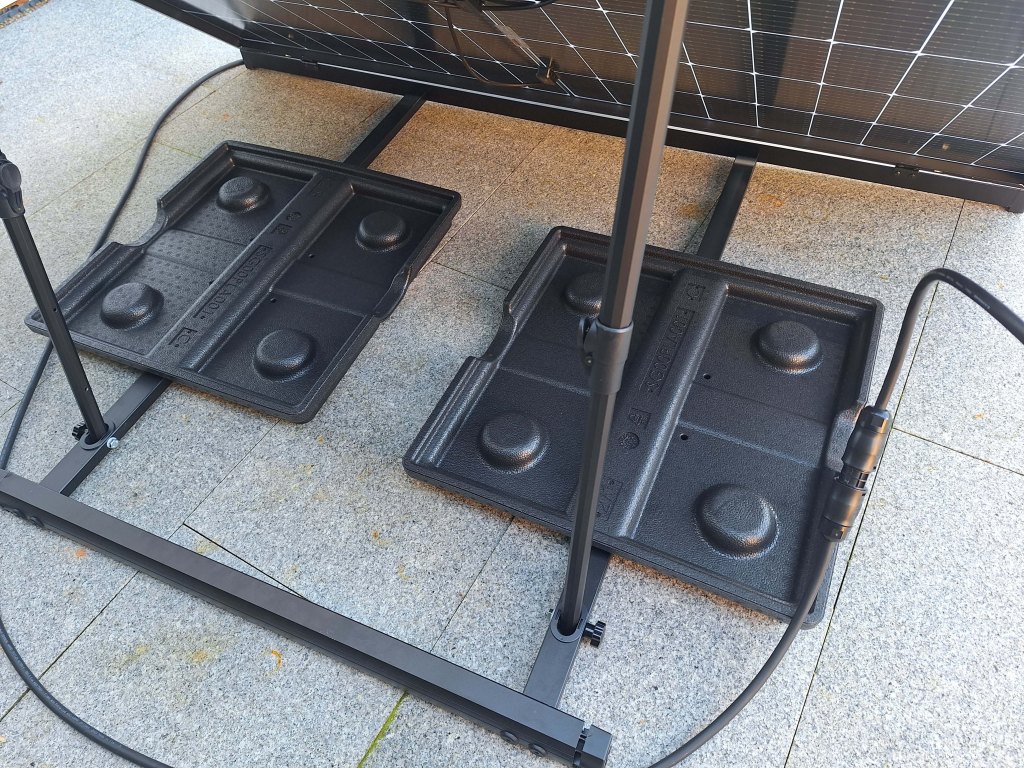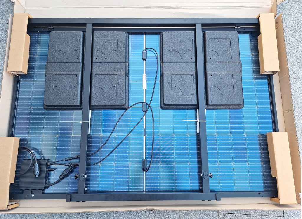Geliefert werden die Komponenten sicher verpackt auf einer Palette per Spedition. Das Gesamtpaket enthält das 405W Dual Glas bifazial Solarmodul, einen bereits installierten Micro-Wechselrichter, eine schwarz eloxierte Aluminium-Halterung, mit welcher sich verschiedene Neigungswinkel einstellen lassen, zwei Einlegeschalen für 55 x 55 Zentimeter große Platten als Stabilisierungsballast, ein drei Meter langes Anschlusskabel und ein IP44-geschütztes WLAN-Energiemessgerät.