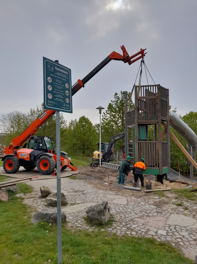Für die Montagearbeiten wurde ein schwerer Teleskoplader angemietet, welcher den Turm aufgerichtet und platziert hat. Bauleiter René Hestencz zeigte sich sehr zufrieden und ist glücklich, dass die Aufstellung dank guter Vorbereitung so reibungslos funktioniert hat. Damit könne die Zielstellung, den Spielplatz zum bis zum Kindertag (1. Juni 2024) freizugehen, weiterhin verfolgt werden. In den nächsten Tagen wird die Einfassung aus Kunststoffpalisaden fertiggestellt und mit der Verlegung der Fallschutzplatten begonnen.
