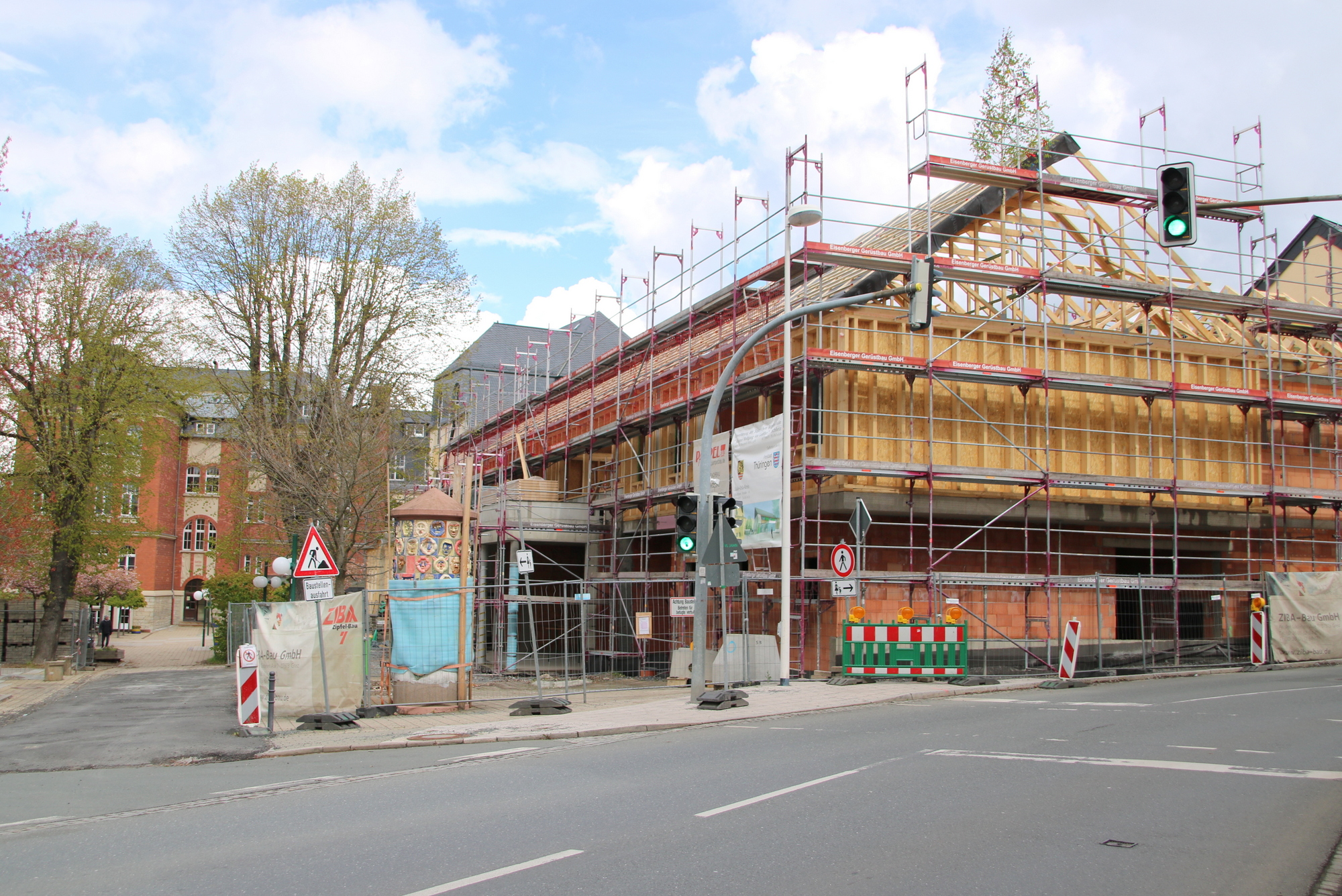 Etwas Besonderes für Schulbauten im Saale-Orla-Kreis ist der gut sichtbare Holzbau-Anteil. So wurde Anfang April mit den Zimmer- und Holzbauarbeiten einschließlich der Holzwände im Obergeschoss begonnen. Die ersten Dachbinder wurden am 10. April montiert. Und nun, kaum zwei Wochen später, war der Richtbaum geschmückt und es konnte das Richtfest gefeiert werden.