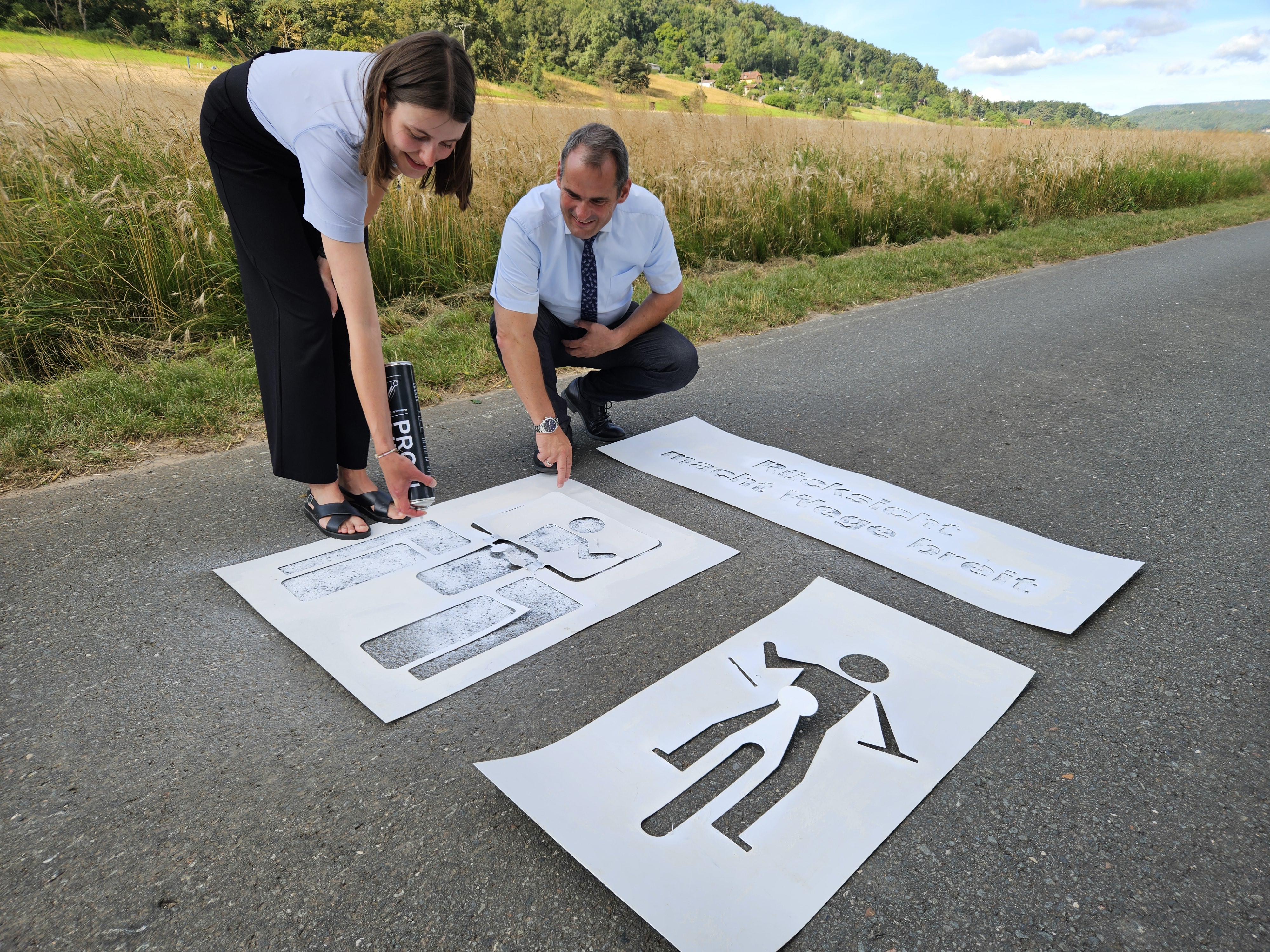 Während des Termins wurden beispielhaft spezielle Hinweismarkierungen auf dem Weg angebracht. Diese Materialien (Schablonen und Farbe) stehen ab sofort den Betreibern der Radrouten bzw. den touristischen Reisegebieten, den Mitgliedskommunen des AGFK Thüringen und des Thüringer Bauernverbandes kostenlos zur Verfügung. Sie sollen helfen, die Botschaft der gegenseitigen Rücksichtnahme sichtbar zu machen.
