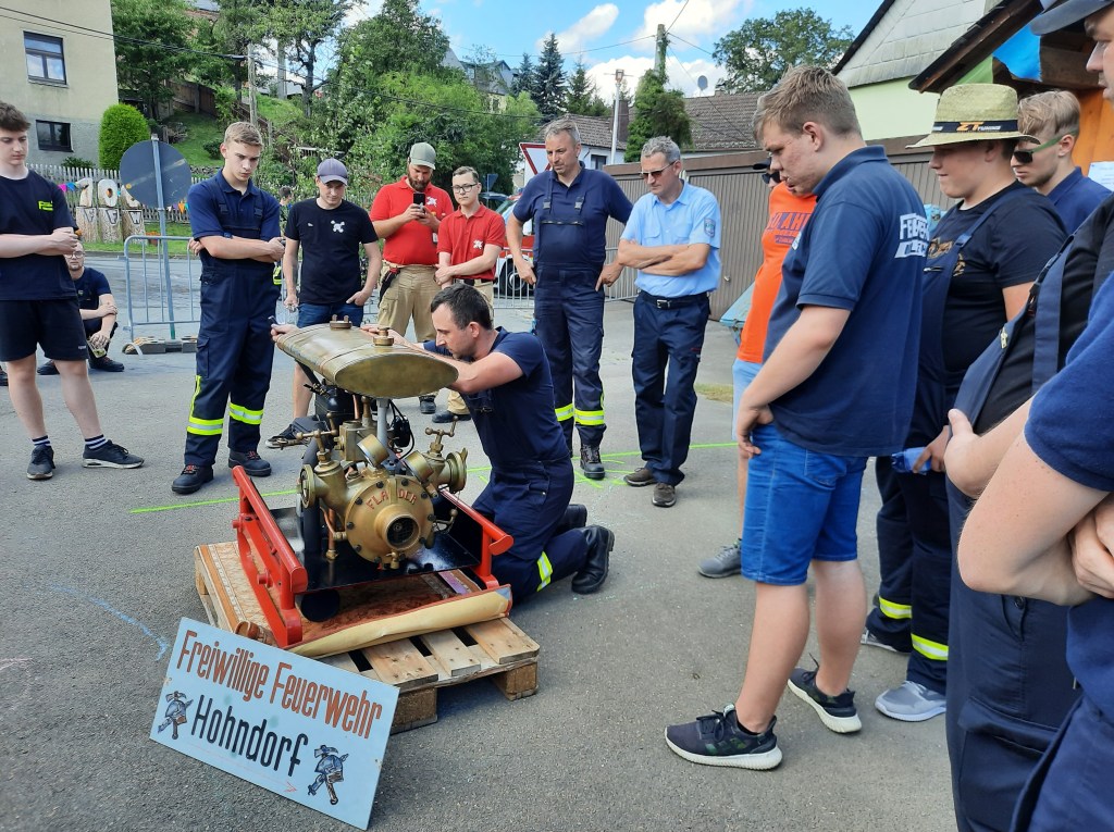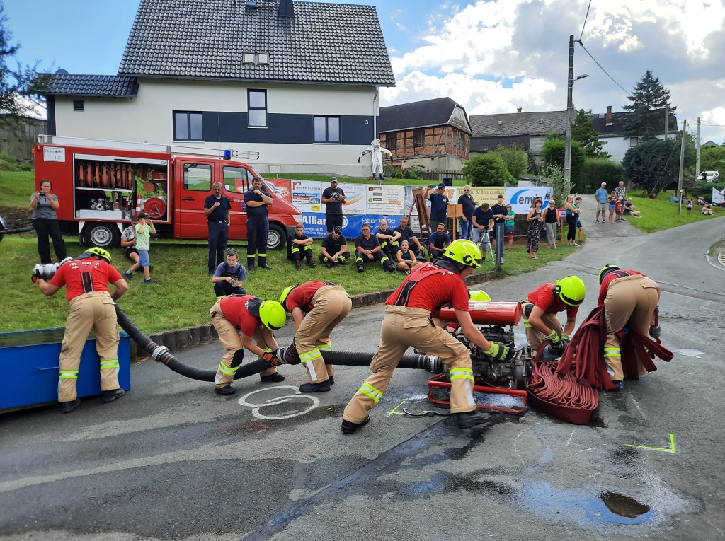 Im folgenden Wettkampf der Feuerwehren traten fünf Wehren im Löschangriff an. Den ersten Platz belegte die Gastgeberwehr Schönbach in 59 Sekunden, den zweiten Platz die Reuther Wehr in 1,10 Minuten, den dritten Platz die Wehr aus Arnsgrün in 1,11 Minuten. Die FFw Hohndorf und die Schönbacher Frauenmannschaft folgten auf Rang vier und fünf.