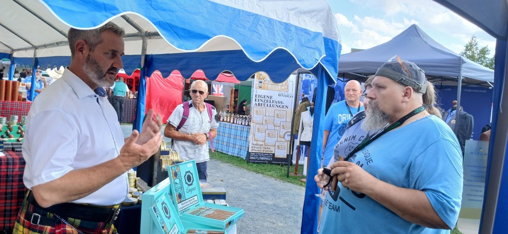 Veranstalter des Events, das bereits zum vierten Mal am Fuß des Unteren Schlosses stattfindet, ist Stephan Roth, der in Zwickau und Rehau die Fachgeschäfte „angel’s share“ betreibt. „Exakt 38 Aussteller aus ganz Deutschland sowie aus Irland und Schottland präsentieren feinste Destillate aus aller Welt“, so der Veranstalter. Dabei geht es nicht nur um Whisky, auch zahlreiche Rum-, Gin- und Zigarrenhersteller und deren Importeure geben sich die Ehre. So kann die größte rauchbare Zigarre der Welt bewundert und gekauft werden. „Wer rauchen möchte, muss etwa fünf Stunden einplanen“, schätzt Stephan Roth ein.