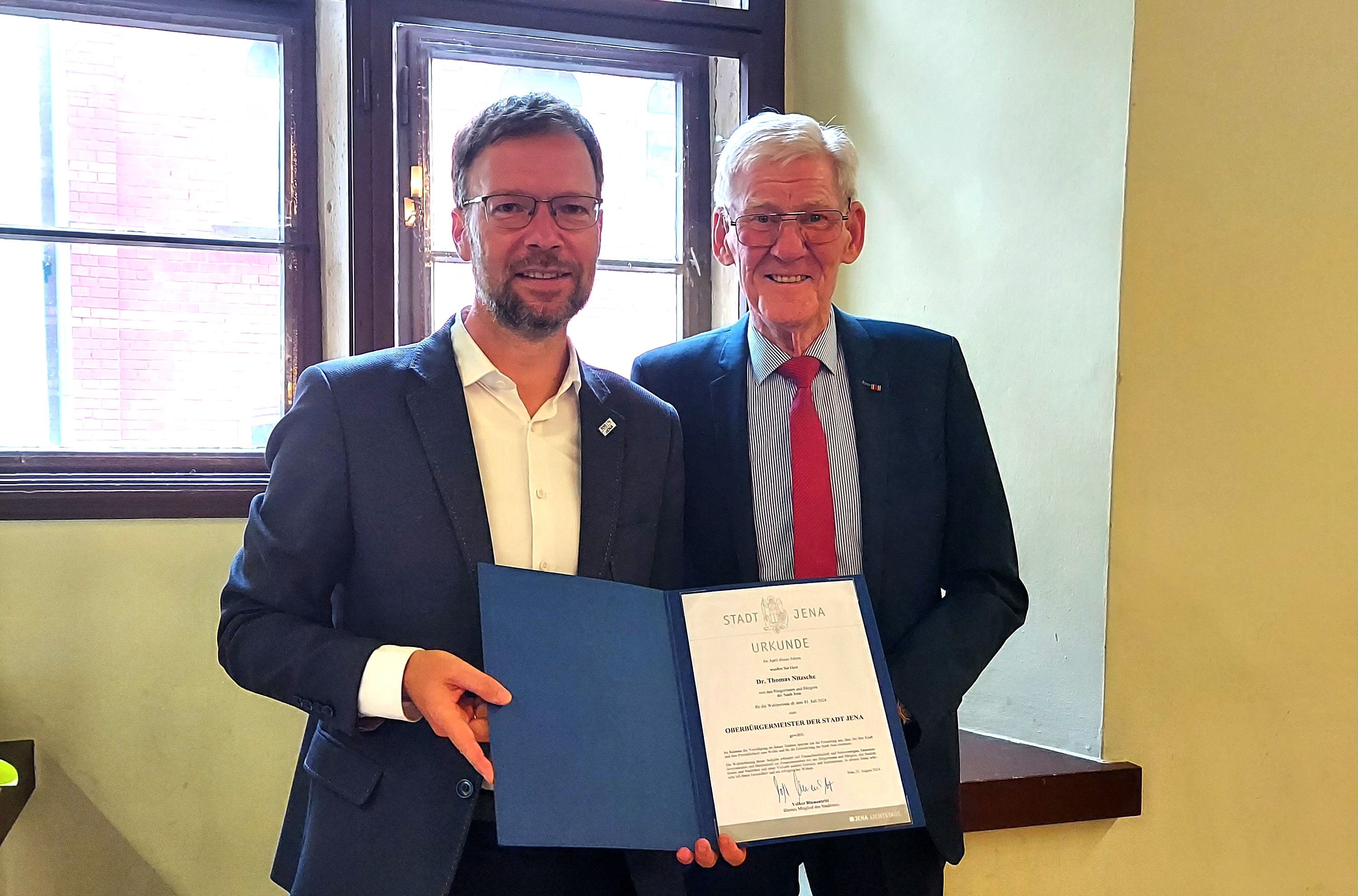 Bei der 2. Sitzung des Jenaer Stadtrates wurde Oberbürgermeister Dr. Thomas Nitzsche offiziell vereidigt. Das dienstälteste Stadtratsmitglied, Volker Blumentritt, der seit nunmehr fast 25 Jahren Stadtratsmitglied in Jena ist, nahm den Amtseid ab.
