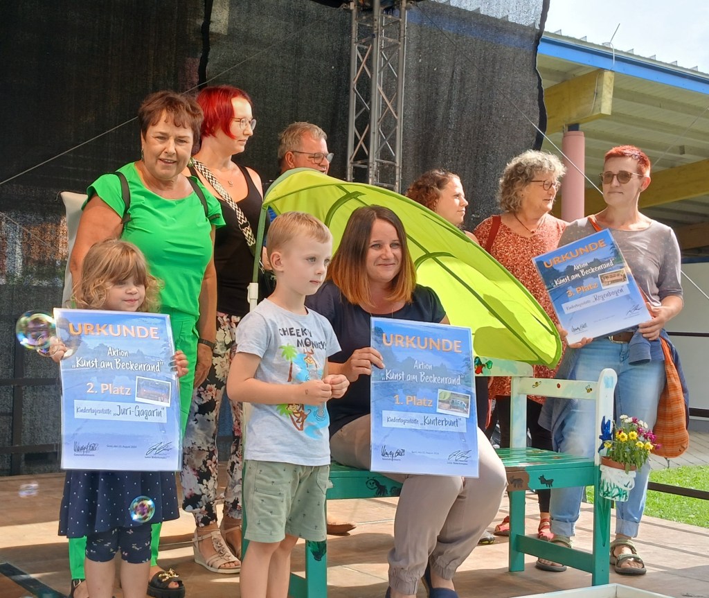 Zu den Höhepunkten des Festwochenendes „100 Jahre Sommerbad Greiz“ zählte am heutigen Sonntagnachmittag die Auszeichnung der Kindergärten, die die schönsten Bänke im Freibad gestaltet haben.
