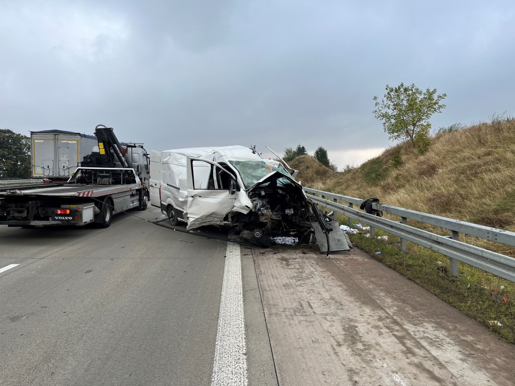 Der 27-jährige Fahrer eines VW Crafters kam zwischen den Anschlussstellen Gera-Leumnitz und Ronneburg nach rechts von der Fahrbahn ab. Er überschlug sich mehrfach im Straßengraben und verkeilte sich folglich auf der Schutzleitplanke. Der Crafter kam auf dem Dach zum Liegen.