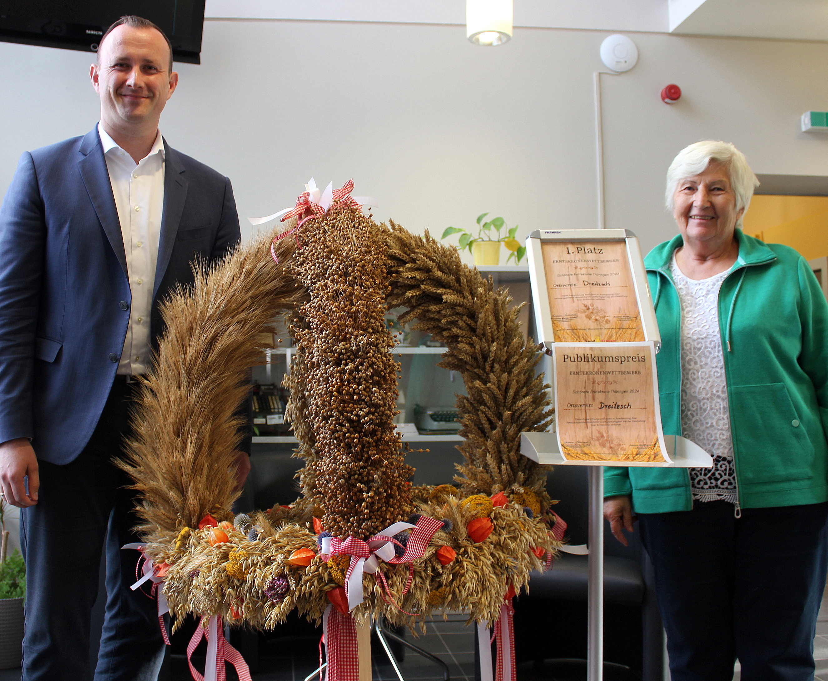 Der Landrat des Saale-Orla-Kreises, Christian Herrgott, gratuliert den Dreitzscher Landfrauen zu ihrem erneuten ersten Platz und freut sich, Thüringens schönste Erntekrone nun im Eingangsbereich des Landratsamtes in Schleiz präsentierten zu dürfen. „Hier sind Geschick, Kreativität und handwerkliches Können gefragt,“ lobt der Landrat. Die wiederholte Teilnahme am Erntekronen-Wettbewerb zeige aber vor allem auch Heimatverbundenheit und Traditionsbewusstsein, so Christian Herrgott.