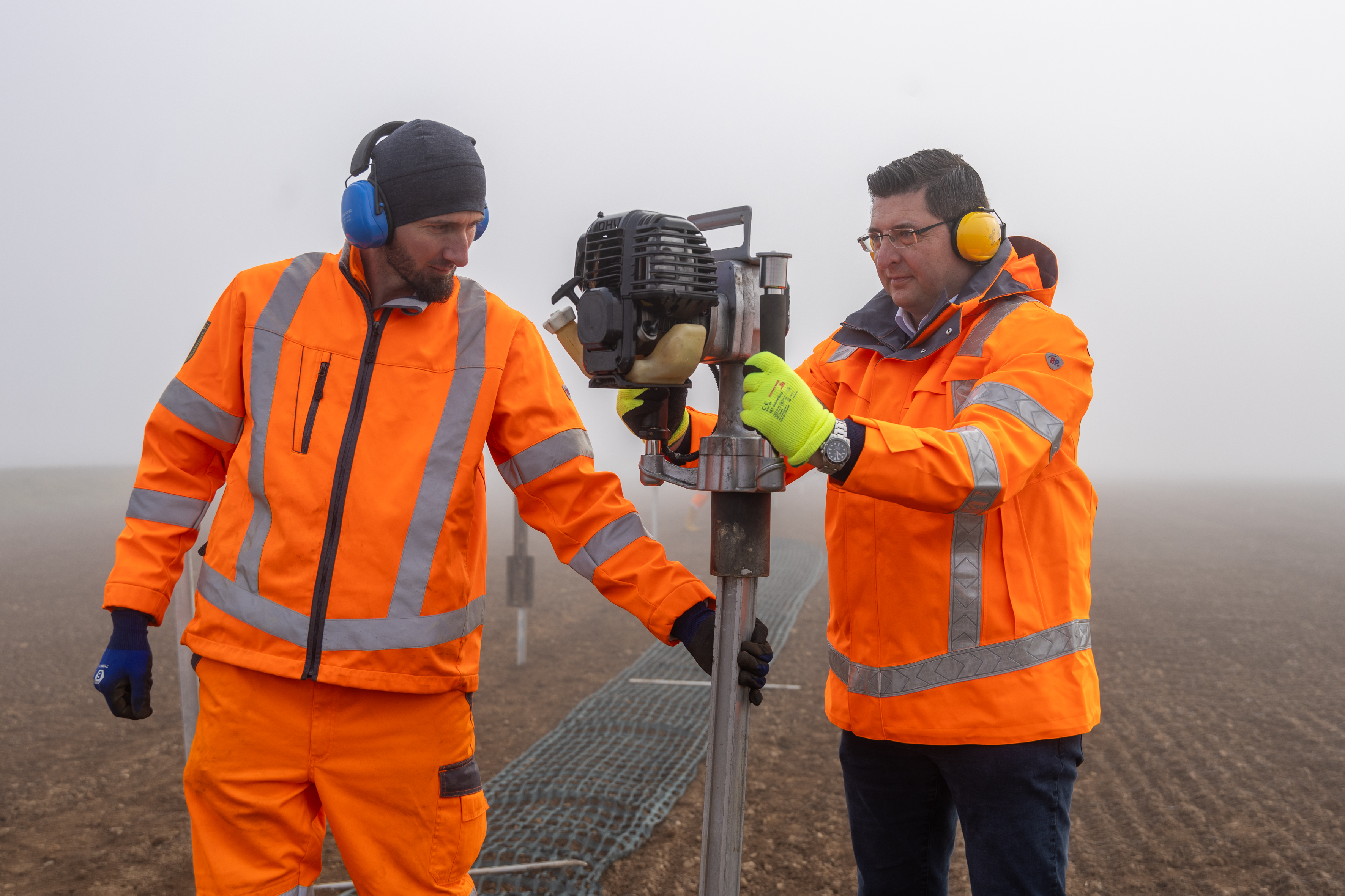 Landrat Thomas Hennig schaute den Mitarbeitern der Straßenmeisterei Plauen beim Aufstellen des Schneezauns An der Schöpsdrehe über die Schulter und legte beim Versenken der Alupfosten im Ackerboden selbst Hand an – mit der mechanischen wie der modernen Motorramme. „So kann ich erleben, wie die Arbeit früher und heute erledigt wurde und wird“, sagte der Verwaltungsleiter. Beeindruckt fügte er hinzu: „Das Verhindern von Schneeverwehungen ist in jedem Fall körperlich harte Arbeit.“