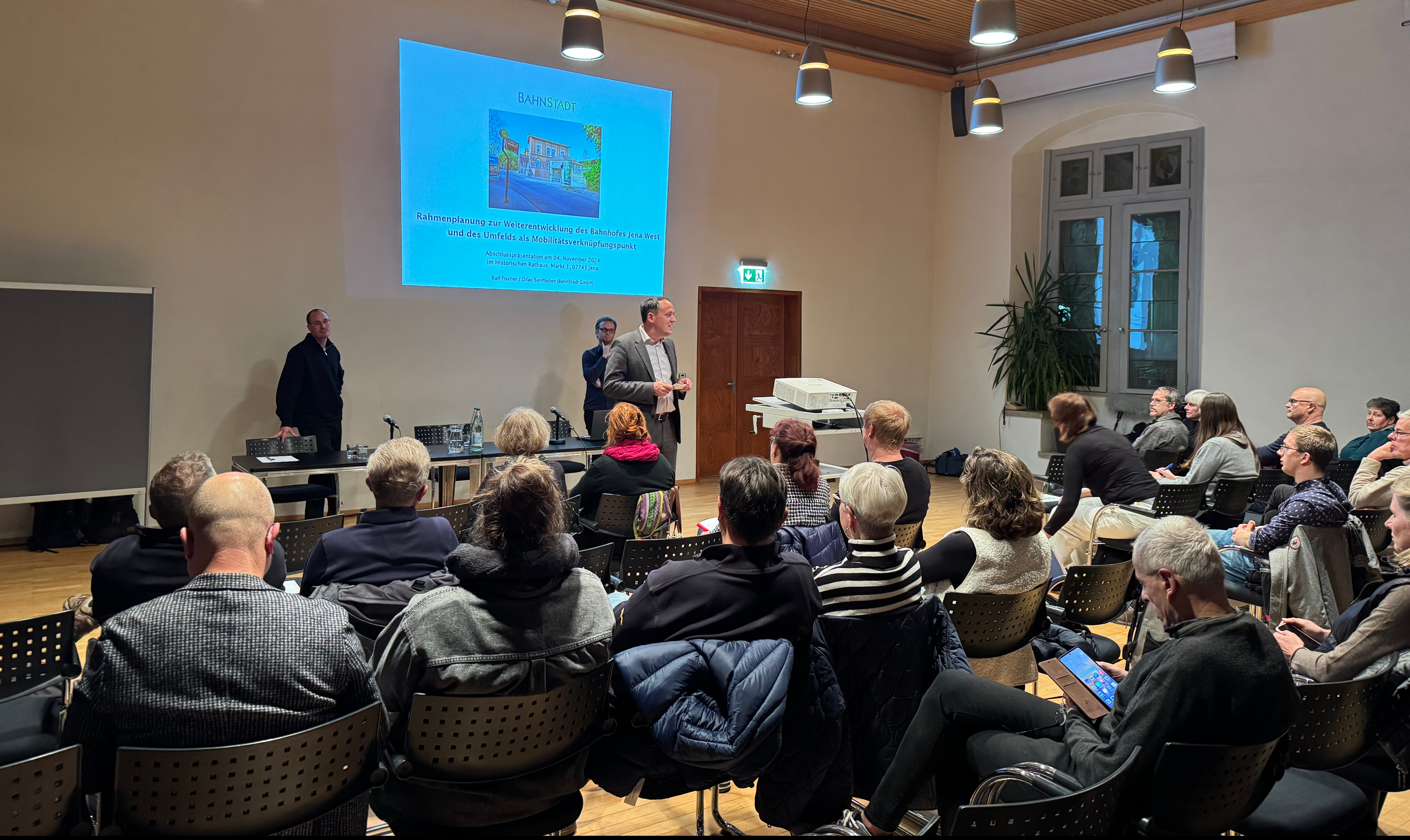 Der Beteiligungsauftakt zum Abschluss der Bearbeitung des Rahmenplans fand am gestrigen Montagabend im Historischen Rathaus statt. Vor rund 50 Personen präsentierte das beauftragte Planungsbüro BahnStadt GmbH den Rahmenplan. Dieser dient als Leitfaden und zeigt eine flexible Herangehensweise für die Entwicklung des Bahnhofsumfelds sowie der Westbahnhofstraße und Schillerstraße, einschließlich Engelplatz, auf. Die Planung zielt darauf ab, das Gebiet attraktiver zu gestalten, insbesondere im Hinblick auf den großen ZEISS-Neubau. Mit dem Bauvorhaben entstehen neue Wegebeziehungen für Gäste, Pendler, Berufstätige und Studierende. Aufgrund des zu erwartenden Anstiegs an Fahrgästen gewinnt das Gebiet zunehmend an Bedeutung. Der Bereich soll daher zu einem gut funktionierenden Mobilitätsverknüpfungspunkt entwickelt werden, der Bus, Bahn, Fahrrad und Auto miteinander vernetzt und den Umstieg zwischen diesen Verkehrsmitteln erleichtert.
