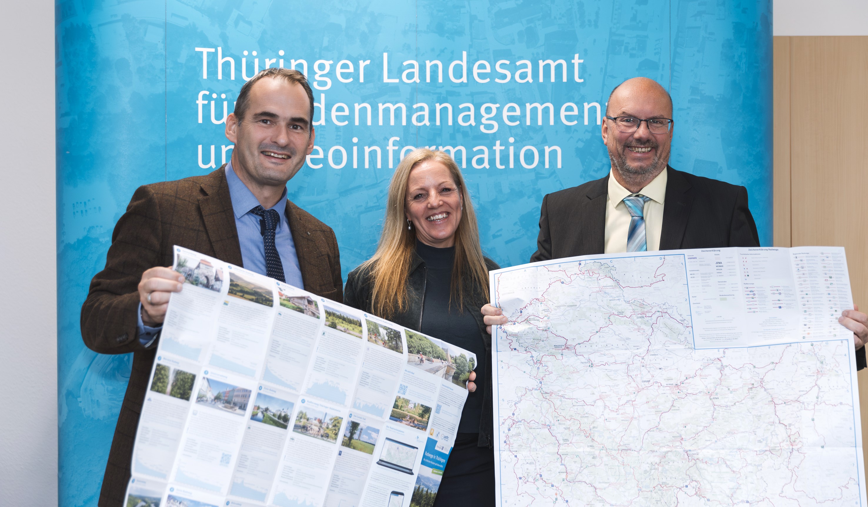 Nach der gemeinsamen Übersichtskarte „Der Lutherweg in Thüringen“ zum Reformationsjubiläum 2017 und der BUGA-Karte 2021 konnte jetzt die dritte Übersichtskarte gemeinsam erstellt werden. Die Auswahl der Wege, die Bereitstellung der Tourendaten und Wegelogos erfolgte in enger Zusammenarbeit der TTG mit dem TLBG sowie mit dem Ministerium für Infrastruktur und Landwirtschaft sowie dem Thüringer Landesamt für Bau und Verkehr, welches den Thüringer Radroutenplaner betreibt. Die Kartographische Bearbeitung sowie den Satz der Rückseite erstellten Mitarbeiter des TLBG. Der neue Radwegekarte wurde im Landesamt gedruckt.