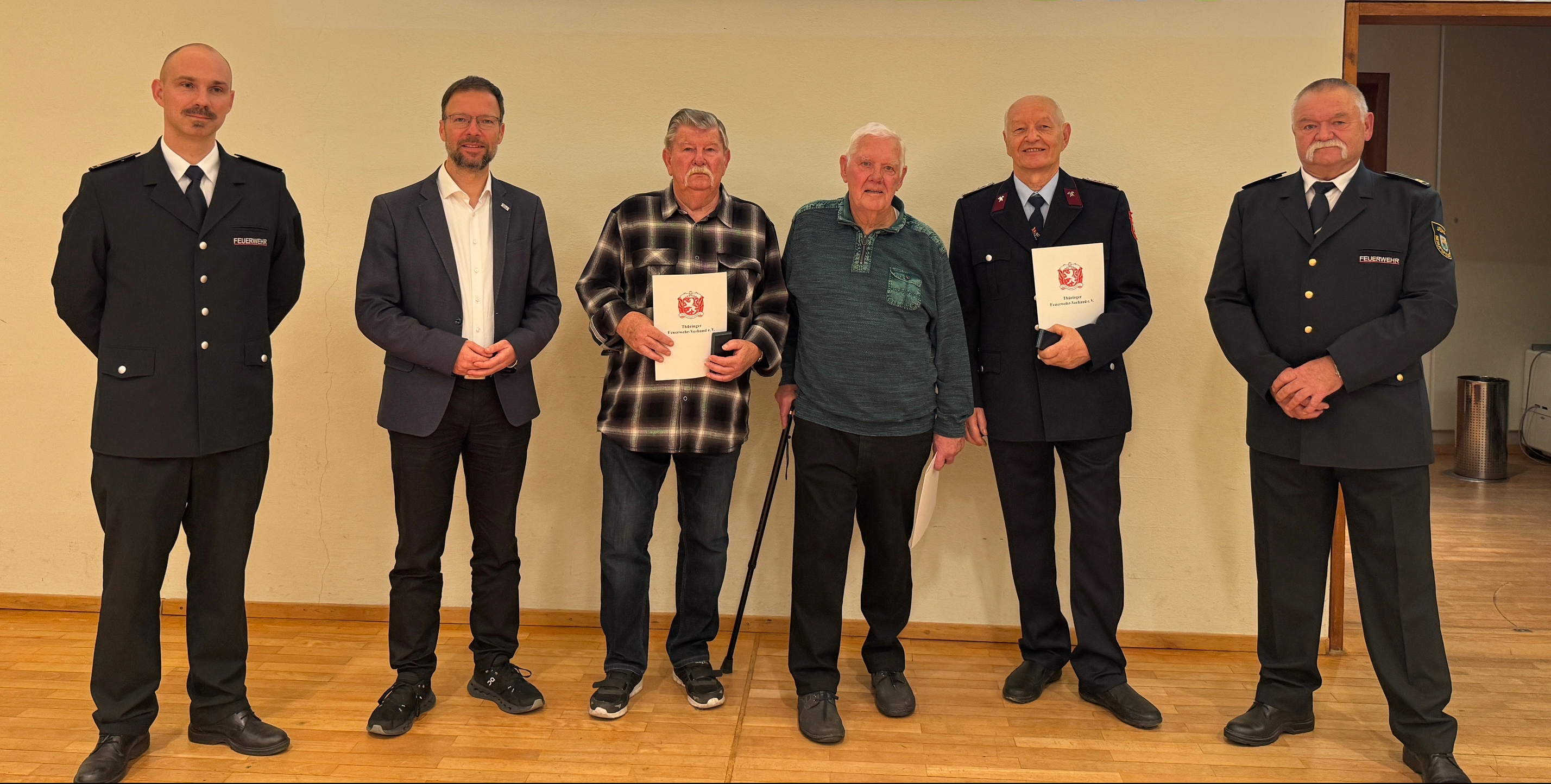 Der festliche Höhepunkt des Abends war die Auszeichnung langjähriger Kameraden durch den Freistaat Thüringen sowie den Thüringer Feuerwehrverband. Neben den Jubilaren für 10 und 25 Jahre aktiven Dienst wurden die Kameraden Hubert Franke, Ralf Grenzer, Matthias Steiniger und Mario Volkhardt für 40-jährige Mitgliedschaft ausgezeichnet. Für 50-jährige Mitgliedschaft wurden die Kameraden Lothar Ratz und Ulrich Schröder geehrt. Still wurde es im Saal, als Ralf Hertig die einleitenden Worte für den Kameraden Walter Schröter sprach, der nach über 60-jähriger Mitgliedschaft in der Freiwilligen Feuerwehr mit dem großen Brandschutzehrenzeichen in Gold ausgezeichnet wurde