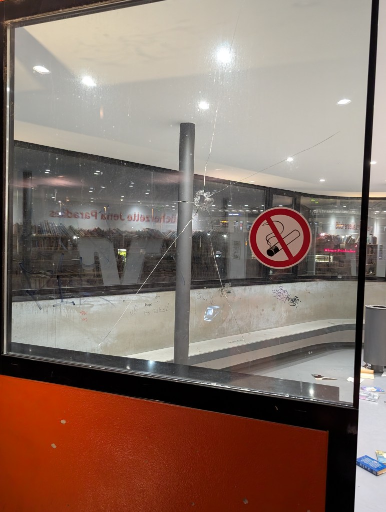 Eine Fensterscheibe wurde mutwillig zerstört, Bücher wurden aus den Regalen gestoßen und im gesamten Bereich verteilt. Der entstandene Schaden beläuft sich auf rund 5.000 Euro.