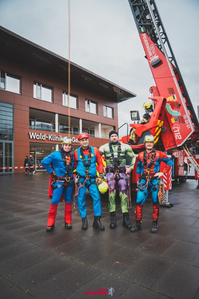 Die Höhenrettung des Amtes für Brand- und Katastrophenschutz der Stadt Gera schlüpfte erneut in Superhelden-Kostüme, um den jungen Patientinnen und Patienten kleine Geschenktüten zu überreichen. Dabei kamen die kostümierten Feuerwehrmänner und -frauen aber nicht einfach zur Tür herein, sondern durchs Fenster.