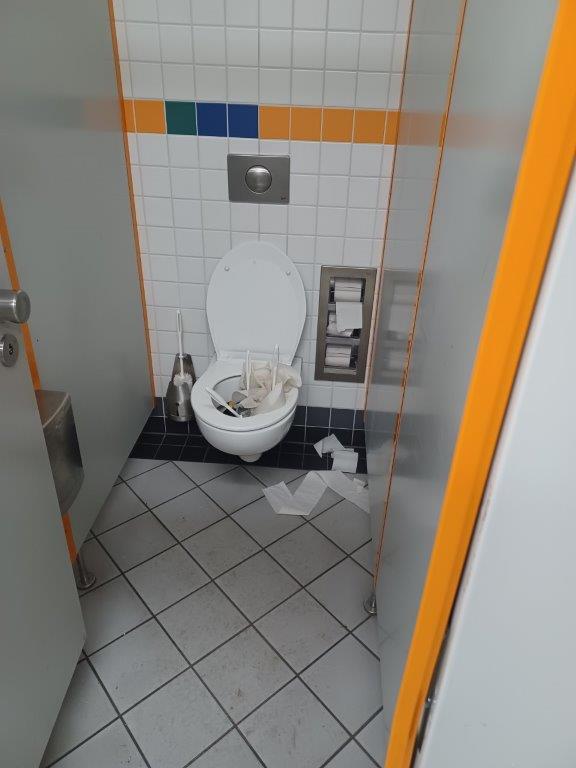 Zu den Schäden zählen eine verbogene Tür im Damen-WC, eine abgerissene Informationstafel sowie die Zerstörung einer Sicherheitsleuchte. Auch die Automatiktür am Eingang wurde beschädigt und muss neu justiert werden.