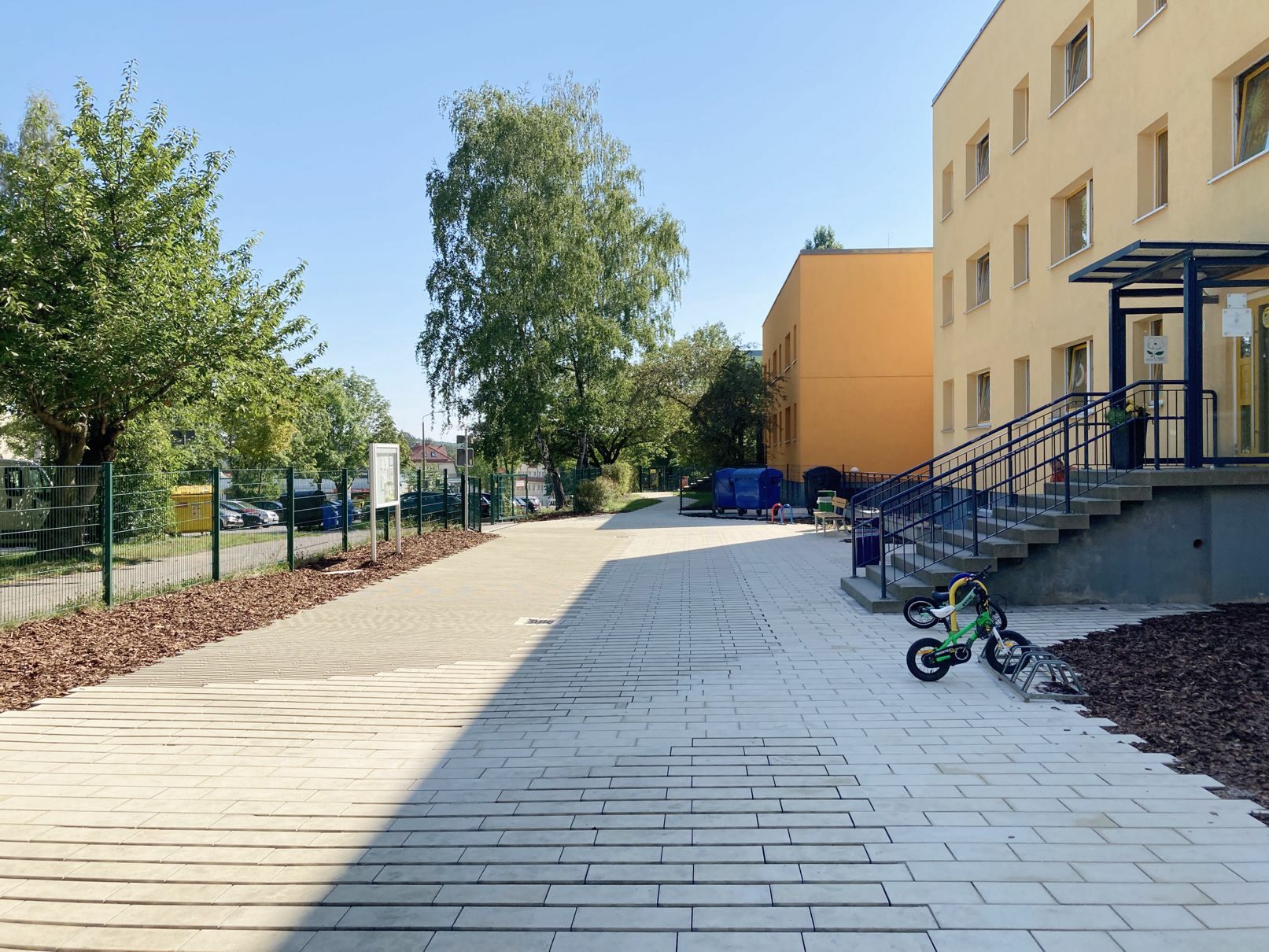 Seit Mai 2024 erfolgte die Sanierung des Vorplatzes am Eingangsbereich. Im Rahmen der Baumaßnahme wurde die alte Schotterfläche zurückgebaut, die Grundleitungen zur Flächenentwässerung erneuert und eine sogenannte Kiesrigole eingebaut, die ab sofort für das Versickern des Regenwassers auf dem Grundstück sorgt.