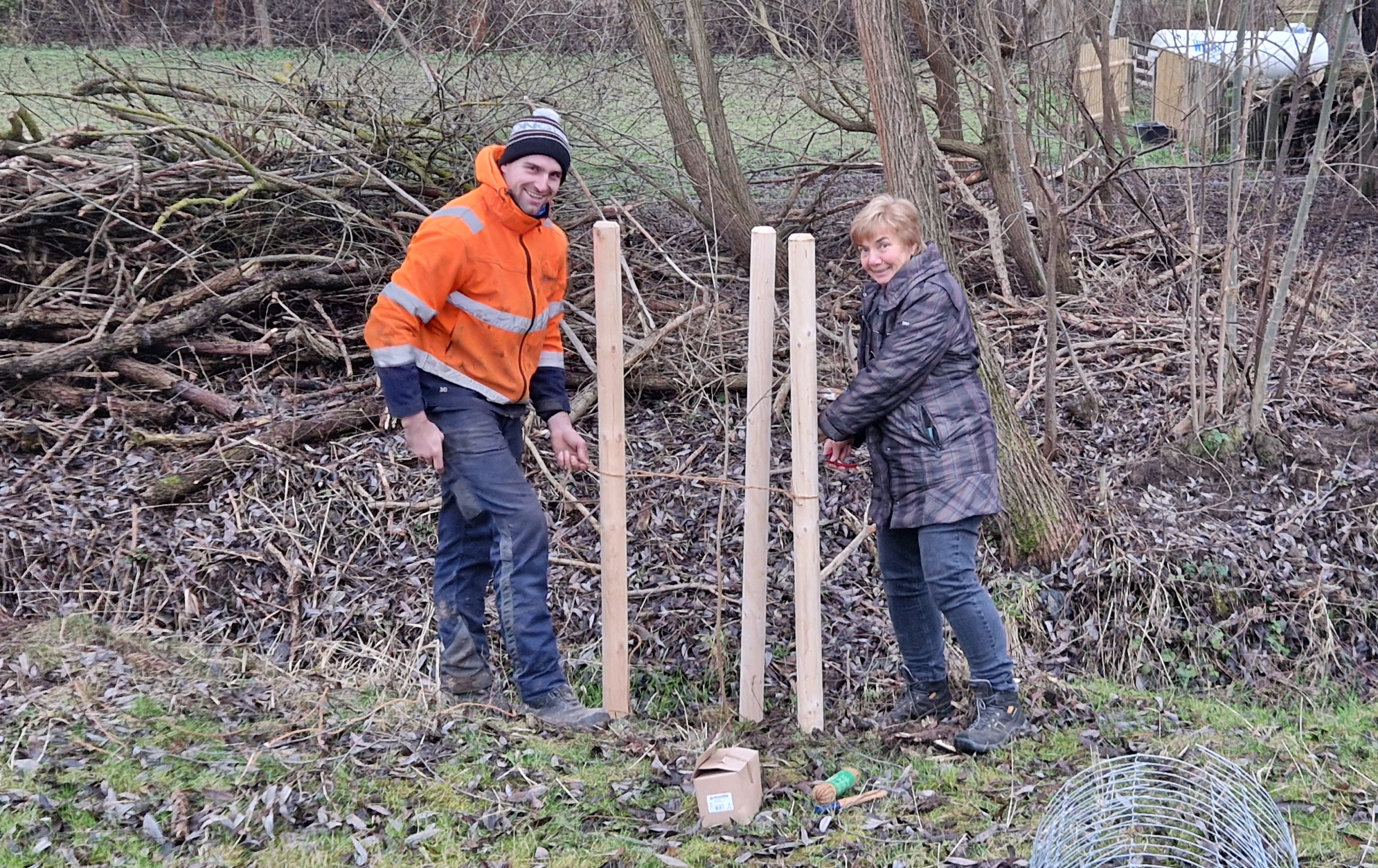 Der Standort wurde gemeinsam aufgrund seines typischen Auencharakters ausgewählt. Die Bäumchen sind mit einem Dreibock fixiert und einem Drahtgeflecht vor Wildverbiss geschützt. Neben dem Unterhalt der Fließgewässer 2. Ordnung gehört auch das Anpflanzen von standortgerechten Bäumen am Gewässer zu den Aufgaben des GUV.