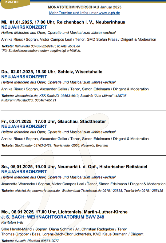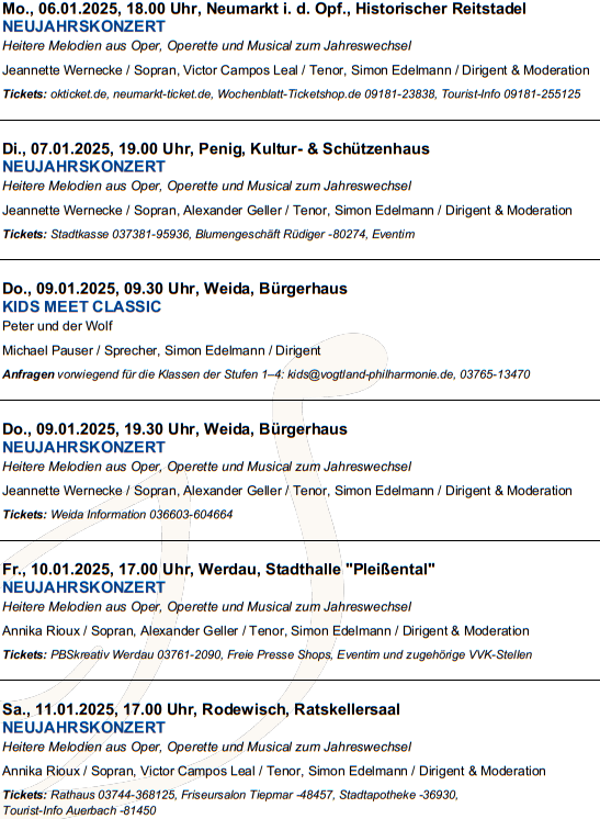 Das alte Jahr neigt sich rasant dem Ende entgegen und Silvester steht vor der Tür. Die Vogtland Philharmonie Greiz-Reichenbach startet in das Jahr 2025 mit einem wahren Konzertmarathon durch Thüringen und Sachsen mit Abstechern in die Oberpfalz.