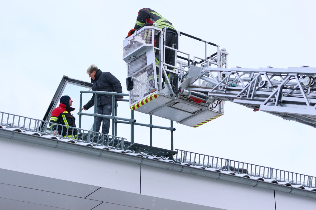 Die Drehleiter kam zudem erfolgreich zum Einsatz, um eine Personenrettung über das Dach zu simulieren.