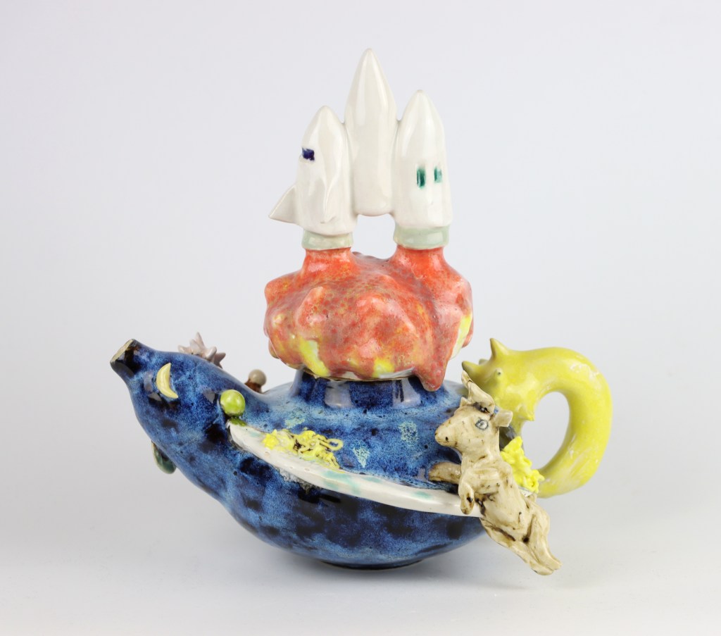 Eine Teekanne der Keramikkünstlerin Nora Arrieta entführt in die Welt surrealistischer Träume. Am blauen Körper der Kanne ist ein Planetenring angesetzt, auf dem eine Ziege durchs Weltall schwebt. Sterne, Zwergplaneten und eine Mondsichel zieren den Ausguss, während der Griff in Form einer Sternschnuppe gestaltet ist. Auf dem Deckel der Kanne hebt eine Rakete gerade zum Flug ab. Lavaartig überziehen die heißen Gasflammen des Raketenstarts den Verschluss.