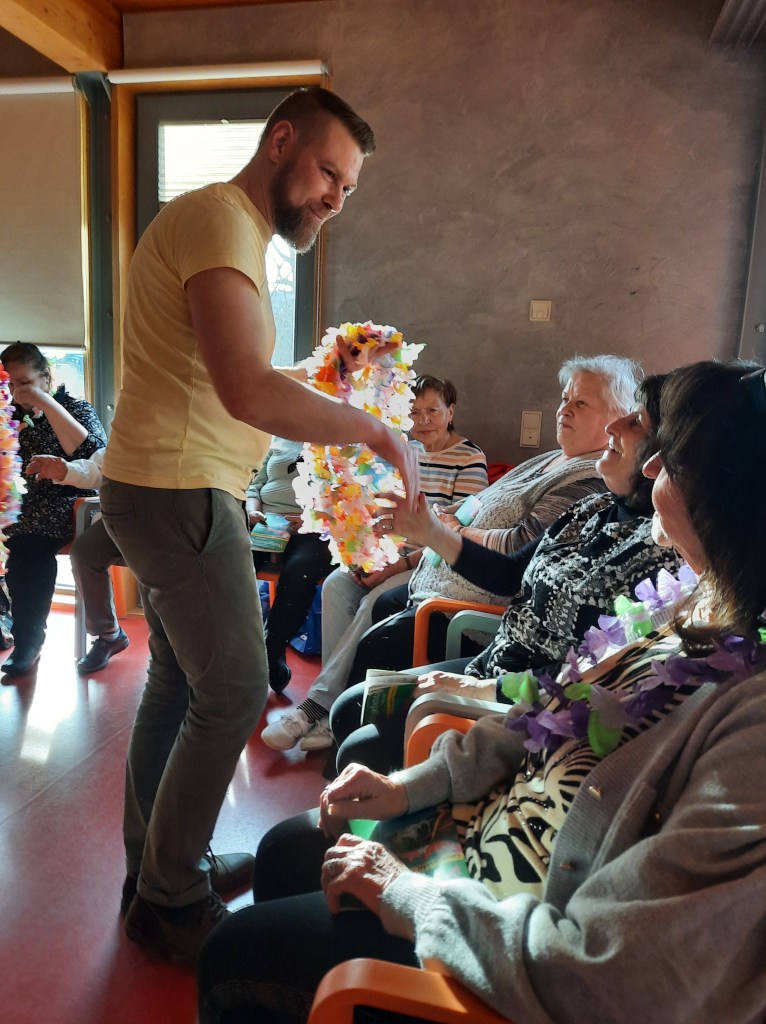 Foto: Zur Begrüßung verteilte Pfarrer Gunnar Peukert an alle Blumenkränze.