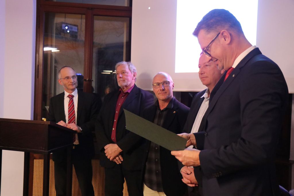 Über den ersten Preis in dieser Kategorie freuen konnten sich die drei Autoren der Bücher „Thüringisch-fränkischer Schieferbergbau“, Frank Barteld, Siegfried Scheidig und Frank Schein. In ihrer Begleitung war auch Verlagsgründer Hans-Jürgen Barteld und der Saalfeld-Rudolstädter Landrat Marko Wolfram, der das Projekt der Schieferbücher von Anfang an maßgeblich unterstützt hatte und der als erster gratulierte. „Die Auszeichnung ist höchst verdient und ich freue mich nun umso mehr auf Band 5, der überwiegend die fränkische Seite bearbeiten wird.“