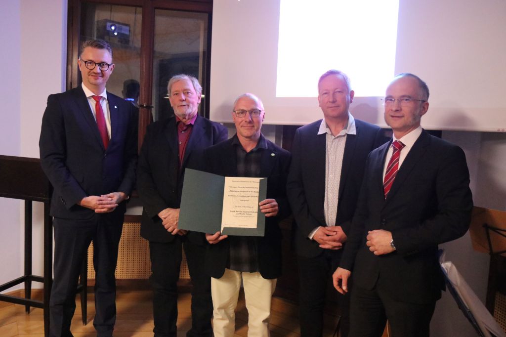 „Zahlreiche Einreichungen unterschiedlichster Formate gingen hier bei der Historischen Kommission für Thüringen ein“, so Mappes in der Laudatio. „Ein Beitrag stach besonders qualitätsvoll hervor – so dass wir uns als Jury rasch einig waren, dieses Werk müsse unbedingt ausgezeichnet werden: Die von Siegfried Scheidig, Frank Barteld und Frank Schein vorgelegten vier Bände „Thüringisch-Fränkischer Schieferbergbau“. Das Werk ist zwischen 2017 und 2022 erschienen und teilweise, bereits in der zweiten Auflage zu haben.