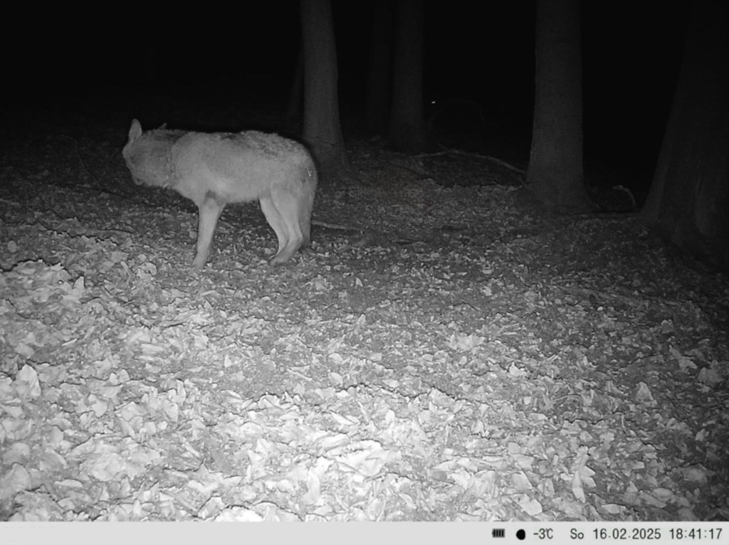 Aktuell tauchen in Thüringen an verschiedenen Orten immer wieder Wölfe auf, kein Wunder bei einer durchschnittlich möglichen Laufleistung von 45 Kilometern pro Tag. So konnte auch am 16. Februar 2025 ein Wolf von einer automatischen Wildtierkamerafalle südlich von Jena fotografiert werden.