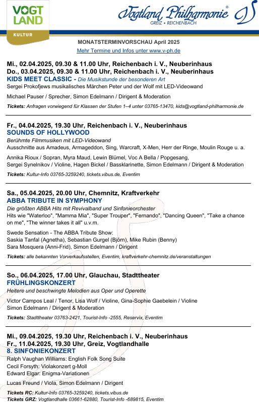 Sounds of Hollywood, Kids meet Classic, ABBA-Tribute und klassische Konzerte – die Vogtland Philharmonie Greiz-Reichenbach bedient auch im kommenden Monat verschiedene Sujets an unterschiedlichen Auftrittsorten.