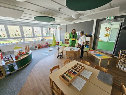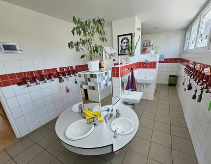 Hier steht Personen mit Handicap ein behindertengerechtes WC und ein Personenlift zur Verfügung, um in die oberen Etagen zu gelangen. Durch die Erweiterung des Eingangsbereiches um eine Etage konnten zudem zusätzliche Räume geschaffen werden: ein Abstellraum für Kinderwagen, ein Snoezelen-Raum für die Kids zur Entspannung und Anregung der Sinne und ein Sprachlabor zur individuellen Sprachförderung.