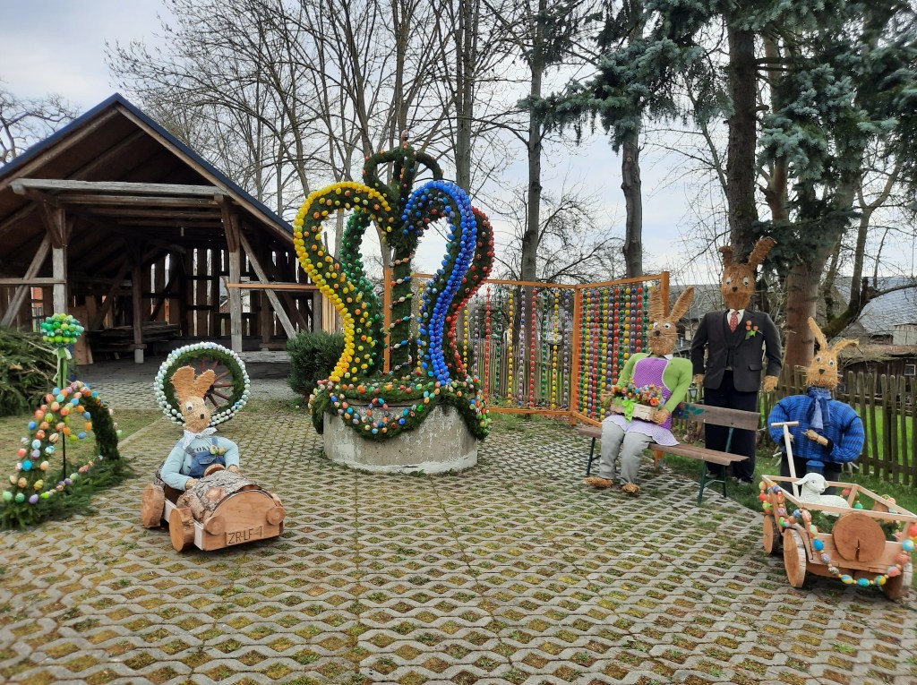 Stand die Osterkrone mal links oder mittig vor dem Feuerwehrhaus, fand sie 2019 einen größeren Platz neben dem Vereinshaus. Dieser ausreichende Platz ermöglichte auch die Umsetzung von weiteren Osterdekorationen durch die kreativen, geschickten Landfrauen, wie die Ostereiergardine, die große Strohhasenfamilie mit Handwagen, die mit Eiern geschmückten Rundbögen und Wagenrad und 2025 die in den Jahren 2020 und 2021 abgespeckte Variante der kleinen Coronakrone. Inzwischen zieren 3.000 Unikate an Ostereiern das gesamte Ensemble und laden alle Gäste aus nah und fern zum Besuchen, Schauen und Staunen ein.
