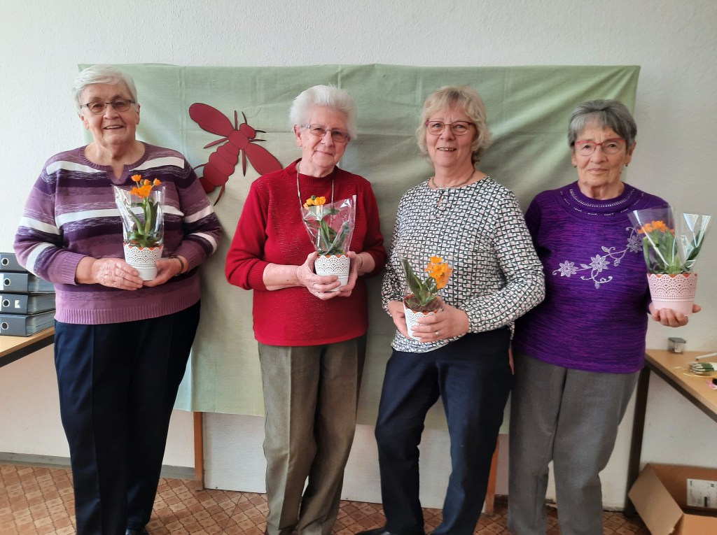 Foto 2: Ein blumiges Dankeschön gab es von Jutta Riedel für die Frauen der ersten Stunde der Osterkrone, die auch heute noch aktiv dabei sind: (von links) Annerose Fröbisch, Monika Neumeister, Jutta Riedel und Renate Helm sowie Christa Auerbach, die leider nicht anwesend sein konnte.