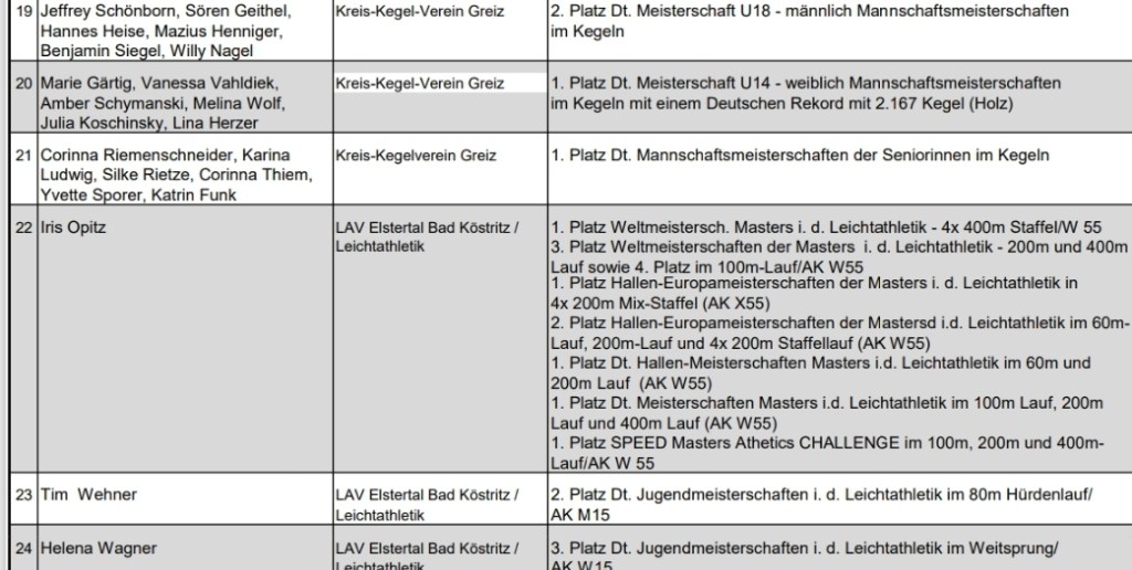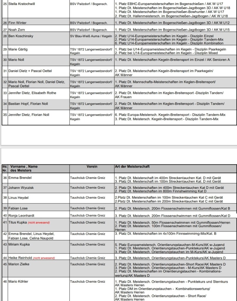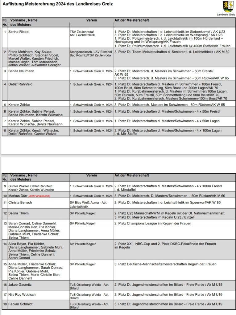 Auf Einladung des Landrates Dr. Ulli Schäfer trafen sich am Freitagabend 70 Sportlerinnen und Sportler des Landkreises Greiz im Gasthaus Simon in Wildetaube. Sie alle haben eines gemeinsam: Sie erkämpften im Jahr 2024 Medaillen bei nationalen Titelkämpfen sowie bei Welt- und Europameisterschaften.