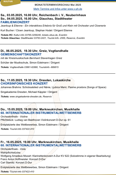 Im Wonnemonat Mai gibt die Vogtland Philharmonie in ihrer Heimatregion Konzerte unterschiedlichster Art und fühlt sich dabei vor allem der Klassik verpflichtet. Das Orchester geht aber auch auf Konzertreise nach Dresden und Nürnberg.