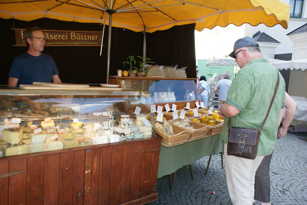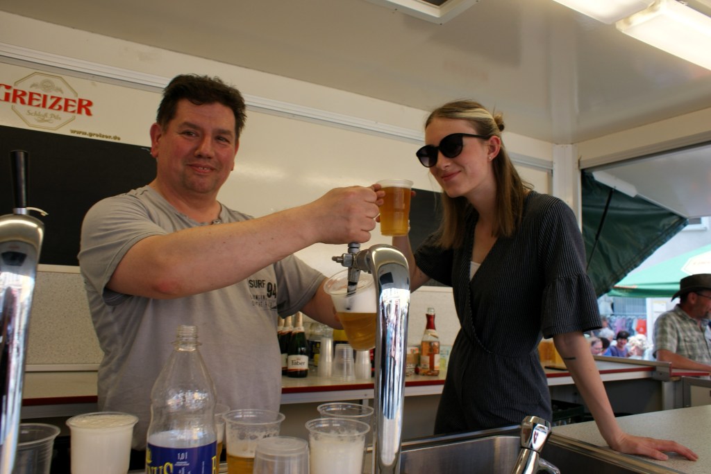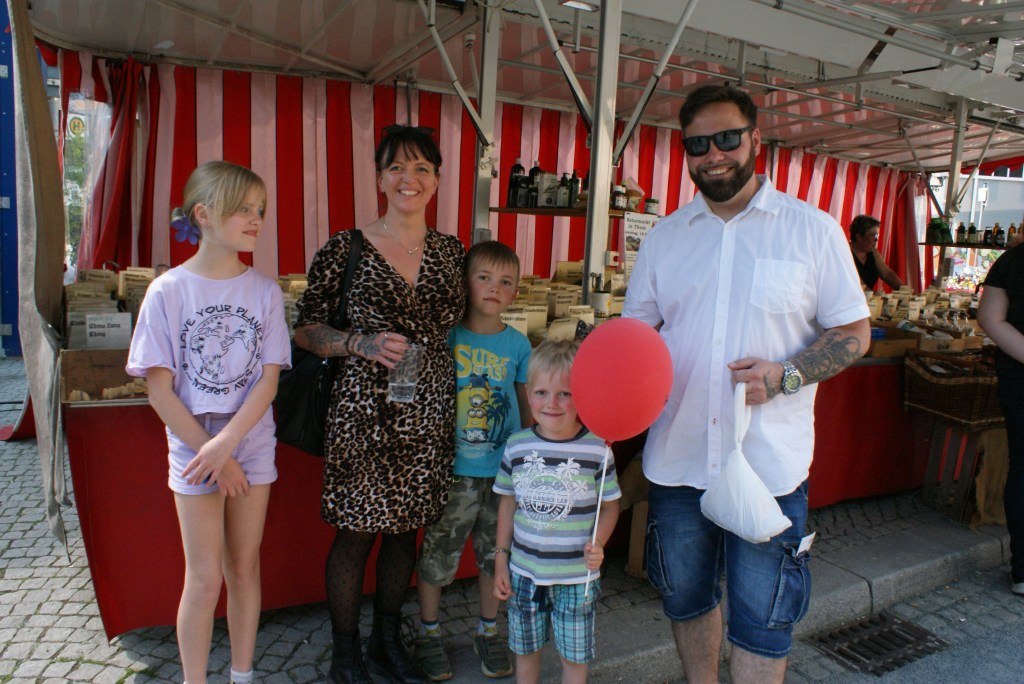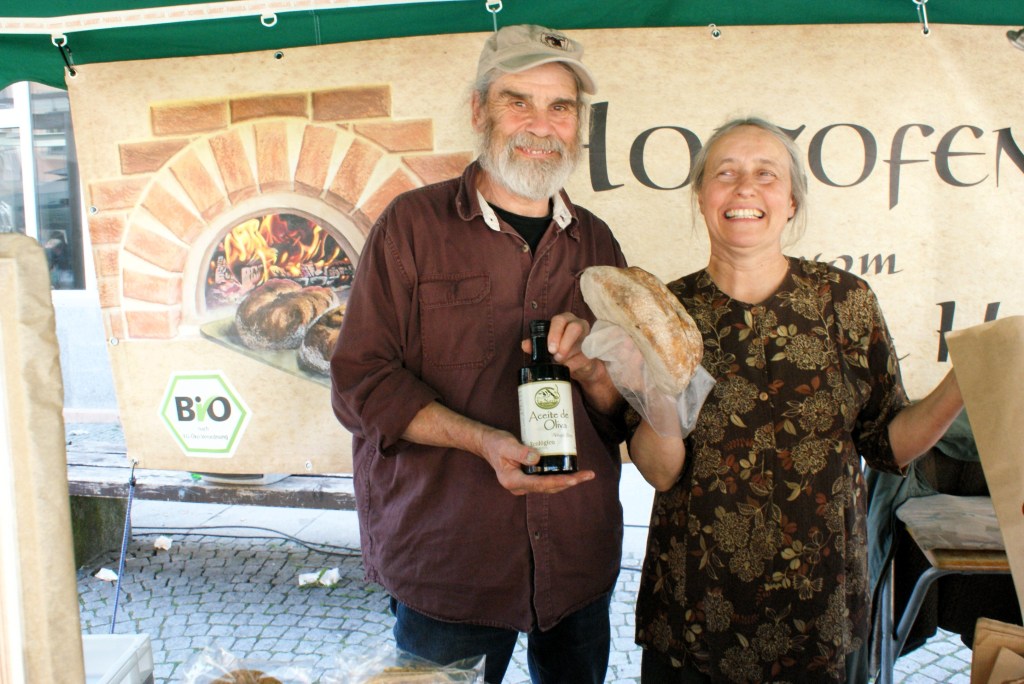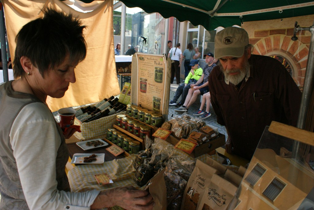 Das erste Mal in Greiz dabei waren Anette und Klaus Schüle aus dem tschechischen Skalná. Das Ehepaar aus Schwaben lebt seit zehn Jahren in dem kleinen Ort nahe der deutschen Grenze und betreibt hier gemeinschaftlich mit weiteren Menschen eine Bio-Farm mit Hofladen. Ihre Erzeugnisse wie das in ihrer Ölmühle gepresste Leinöl oder das in der Hofbäckerei gebackene Dinkelbrot gingen am Donnerstag an dem Stand am Puschkinplatz weg wie die sprichwörtlichen warmen Semmeln. „Uns gefällt es sehr gut hier in Greiz. Die Nachfrage ist toll – das Gesunde kommt halt immer gut an – und Leute sind alle sehr nett. Wir kommen gern wieder“, sagt Klaus Schüle.
