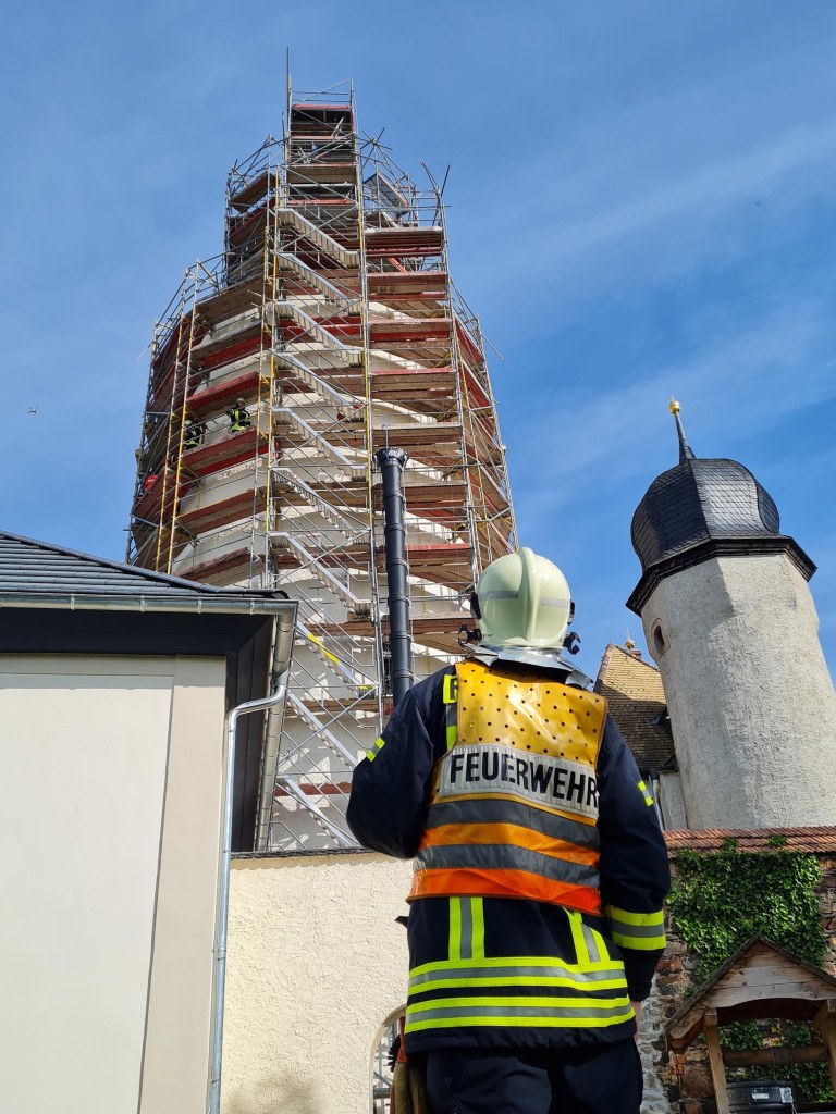 Die Freiwillige Feuerwehr Posterstein hat eine einmalige Chance genutzt und am Gerüst am Bergfried der Burg Posterstein die Höhenrettung eines Verletzten geübt. Dafür arbeitete die Feuerwehr eng mit den Rettungssanitätern der Johanniter, dem Museumsteam und dem für die Baumaßnahme zuständigen Ingenieur für Arbeitssicherheit zusammen.