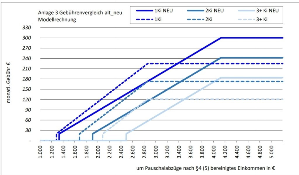 Die Freibeträge für das zweite und dritte Kind sollen jeweils von 400 Euro auf 580 Euro erhöht werden. Die Erhöhung der Freibeträge bedeutet eine signifikante finanzielle Erleichterung für Familien mit mehreren kindergeldberechtigten Kindern im Haushalt. Die Höchstgebühr bei einem, zwei und drei Kindern steigt von 225, 173 und 121 Euro auf 300, 242, 184 Euro. Für Arbeitnehmerhaushalte gilt dies (je nach Kinderzahl) bei einem monatlichen Bruttoeinkommen von 5.580 bis 6.452 Euro.