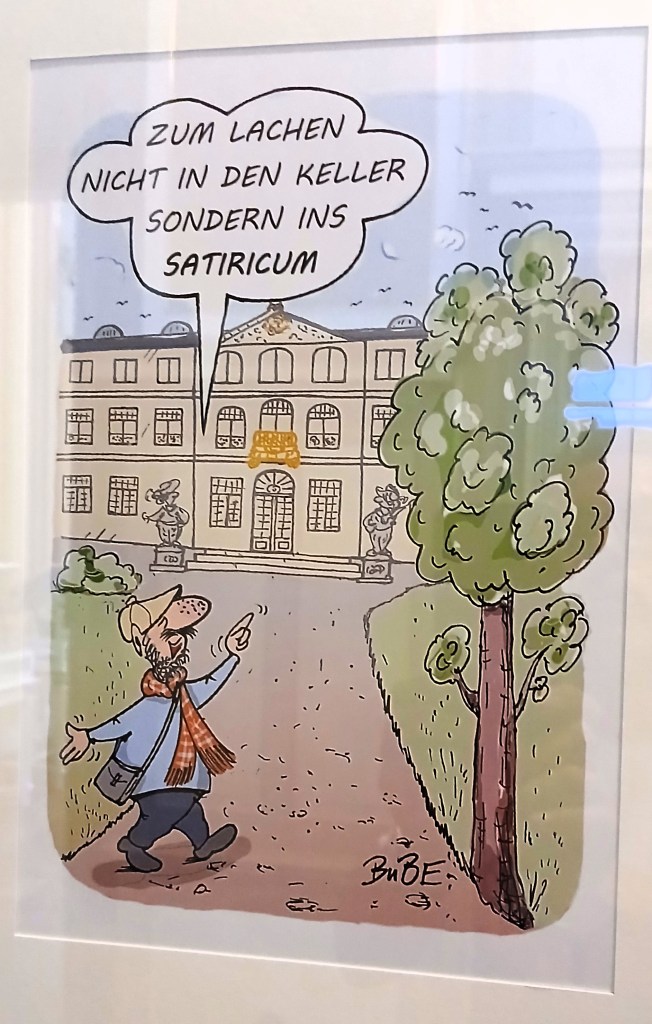 Gezeigt werden im Obergeschoss des Sommerpalais‘ bis zum 1. März 2026 Karikaturen aus dem eigenen Bestand – durch die Ankäufe in den letzten fünf Jahrzehnten verfügt das Haus einen Fundus von über 20.000 Blättern. Rund 200 davon sind in der Ausstellung zu sehen, die Ende Oktober gegen andere Exponate ausgetauscht werden. Eine Besonderheit wird während der gesamten Laufzeit gezeigt: Gezeichnete Grüße zum Jubiläum, mit denen Cartoonisten zum 50-Jährigen gratulieren und ihre Verbundenheit zum Satiricum ausdrücken.