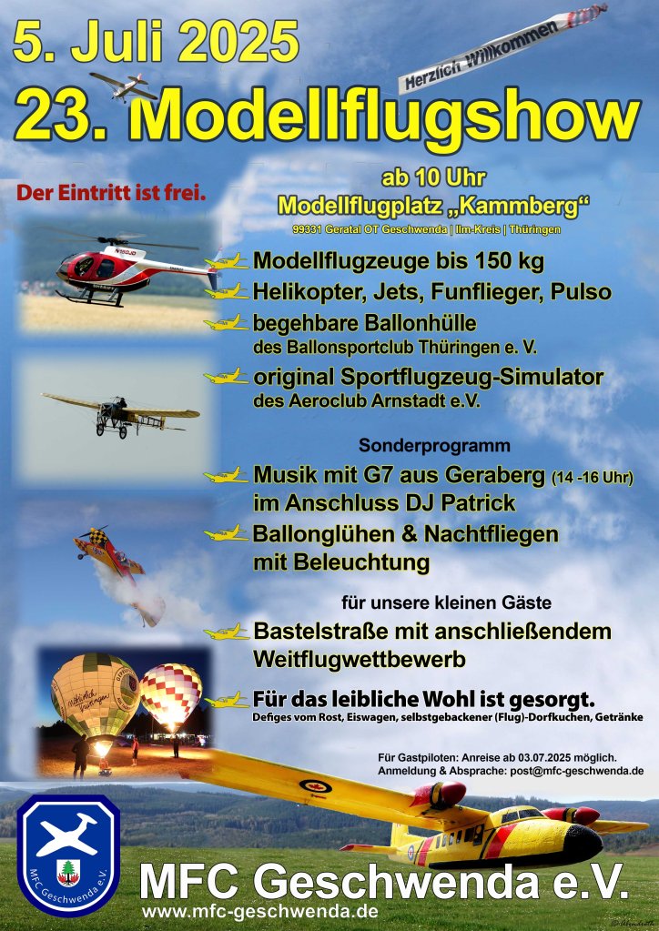 Der Flugtag des MFC Geschwenda e.V. ist seit Jahren ein unverzichtbares Ereignis im Kalender der Gemeinde Geratal und für den Ilm-Kreis. Am Samstag, den 5. Juli, öffnet der Modellflugplatz „Kammberg“ (Ilm-Kreis) seine Tore für eine beeindruckende Show rund um den Luftsport – ein Event, das Besucher aus Nah und Fern anzieht und die Vielfalt des Modell- und Luftsports erlebbar macht.