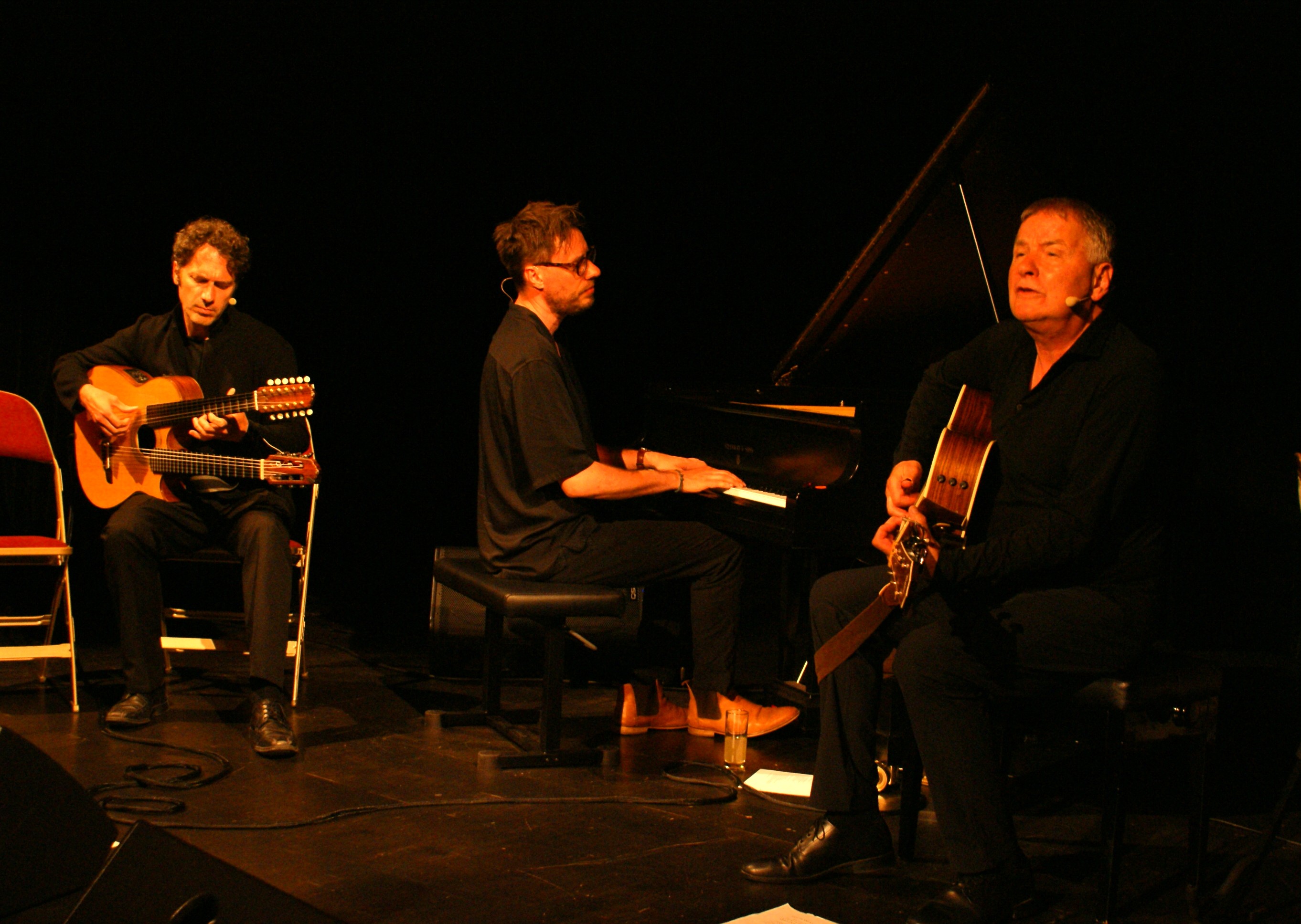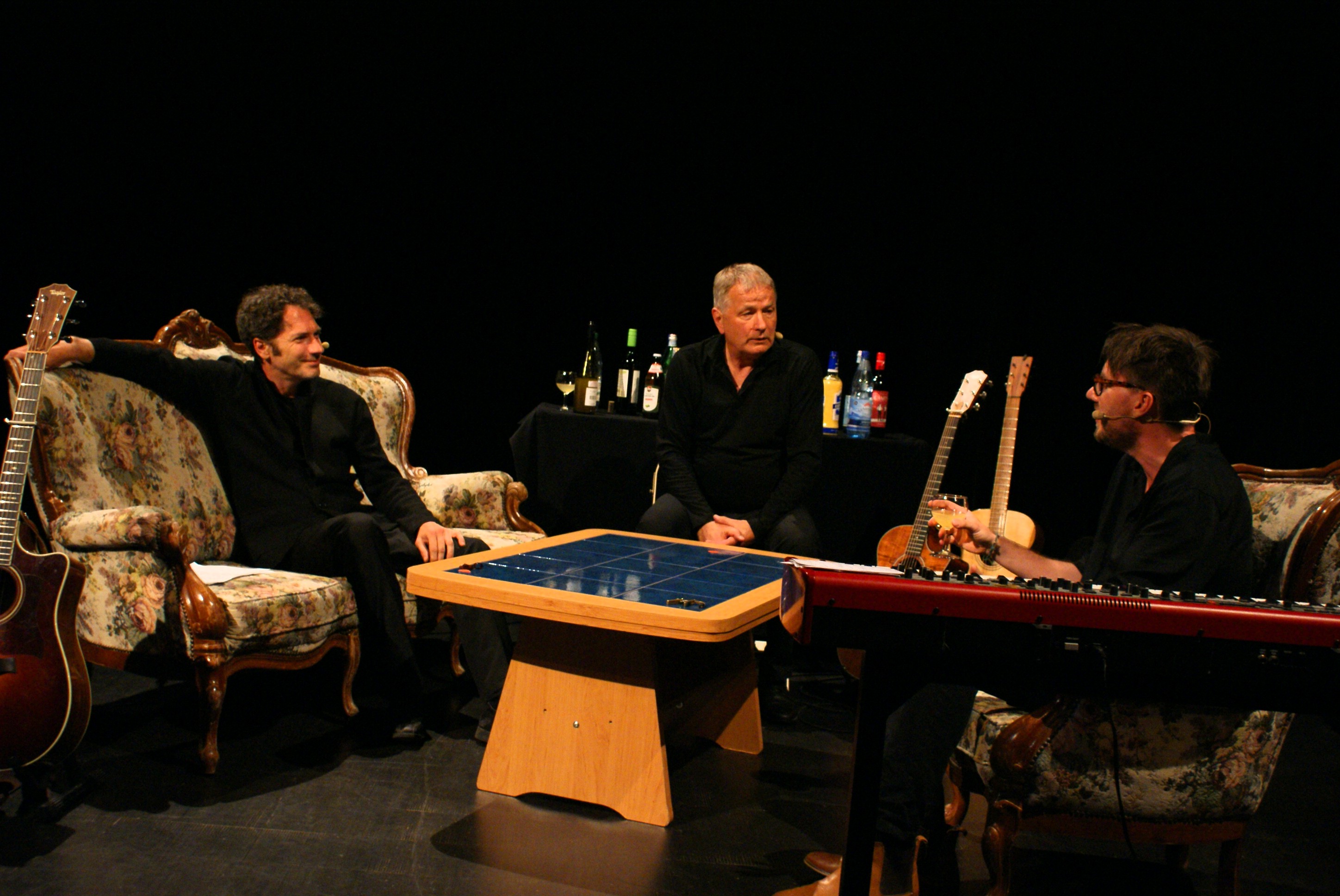 Mit ihrem Programm „Als Tom Waits bei Chuck Berry auf dem Sofa lag“ präsentierten die drei Musiker in der nicht ganz ausverkauften Studiobühne des Hauses Songs, Anekdoten und Geschichten aus fünf Jahrzehnten Pop- und Rock-Geschichte des 20. Jahrhunderts. Dabei interpretierten sie – teilweise ins Deutsche übersetzt und in selbst arrangierten Versionen – Klassiker von den Beatles, Rolling Stones und Simon & Garfunkel über Titel von Bob Dylan, Peter Saarstedt und Neil Young bis hin zu Songs natürlich von Chuck Berry und Tom Waits.