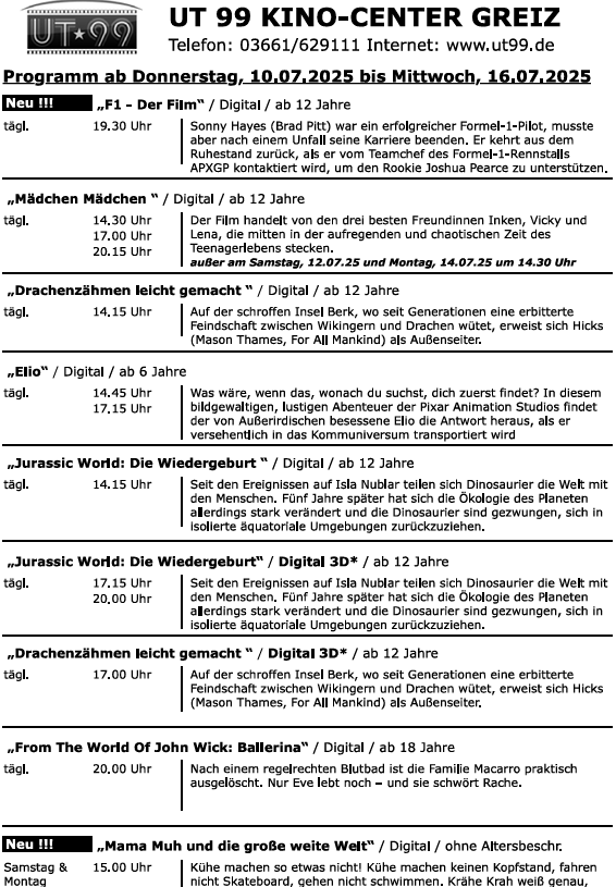 „F1 – Der Film“ mit Brad Pitt als ehemaligen Formel1-Piloten und „Mama Muh …“ neu im Programm. Hier alle Filme im Überblick: