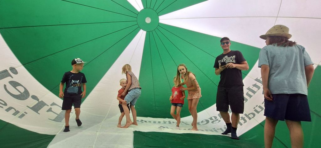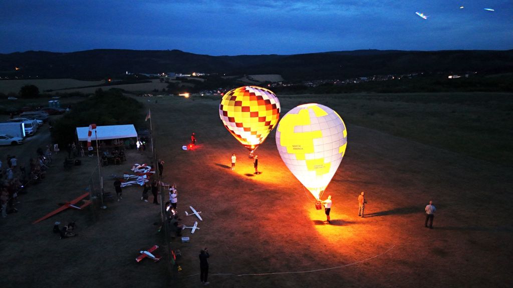 Mit Beginn der zweiten Tageshälfte legte sich zum Glück auch der Wind über dem Fluggelände. So konnten die Heißluft-Modellsportler des Ballonsportclub Thüringen ihre begehbare Ballonhülle entfalten und am Abend mit einem Ballonglühen das Gelände in ein magisches Flair tauchen – und somit das Nachtfliegen der Modellpiloten farbig bereichern.