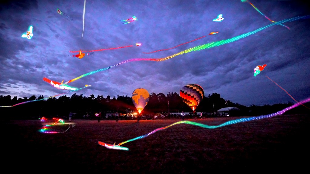 GESCHWENDA (Ilm-Kreis). „So etwas habe ich noch nie live gesehen. Heißluftballone, die so großartig glühen, dazu leuchtende Schmetterlinge und der junge Mann mit seinem beleuchteten Flugzeug – da bekommt man ja Gänsehaut. Einfach nur schön an solch einem Sommerabend“, betont Katja Bauerschmidt aus Hildburghausen. Sie war durch einen Zeitungsbericht auf die Veranstaltung aufmerksam geworden, ist mit der ganzen Familie nach Geschwenda gekommen. Hier präsentierte der MFC Geschwenda e.V. seine 23. Auflage der Modellflugshow auf dem vereinseigenen Modellflugplatz „Kammberg“.