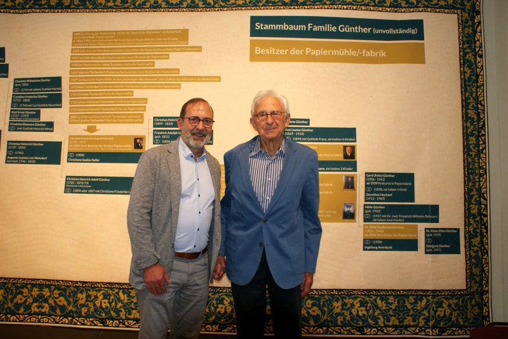 Die Ausstellung im unteren Schloss dokumentiert die wechselvolle Geschichte des Greizer Traditionsunternehmen und thematisiert insbesondere das Wirken der Familie Günther. Zu sehen sind aber auch ein Modell der Papiermaschine VII und andere eindrucksvolle Zeitdokumente.