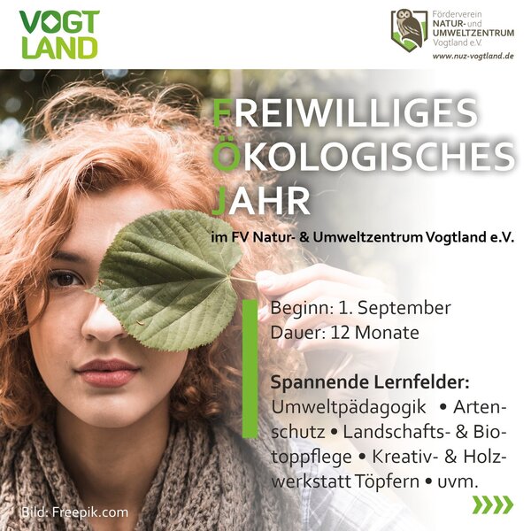 Der Förderverein Natur- und Umweltzentrum Vogtland e.V. setzt sich für den Natur- und Artenschutz ein und vermittelt als Lern- und Erlebnisort den Menschen nachhaltiges und naturverträgliches Handeln. Nun sucht das Team in Oberlauterbach engagierte Unterstützung. Interessierte haben die Möglichkeit, sich im Rahmen des Bundesfreiwilligendienstes (BFD) oder eines Freiwilligen Ökologischen Jahres (FÖJ) im Bereich Umweltschutz einzubringen. Bis zum 15. August können Bewerbungen eingereicht werden.