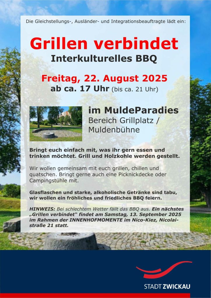 Am Freitag, 22. August, lädt das Team der Gleichstellungs-, Ausländer- und Integrationsbeauftragten erneut ins MuldeParadies ein. Unter dem Motto „Grillen verbindet“ kann wieder in Gemeinschaft nach Herzenslust gegrillt, geschlemmt und gechillt werden.