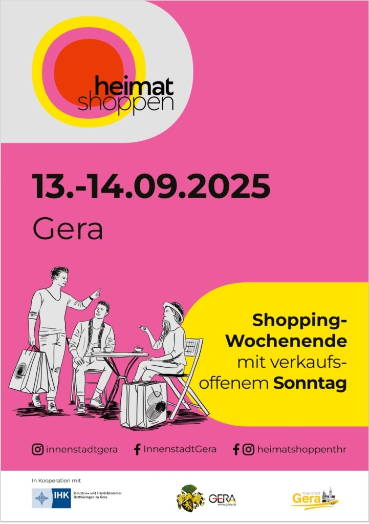 Unter dem Motto „Geraer Shopping-Wochenende“ vereinen die Aktionen Heimat Shoppen und Tag des offenen Denkmals Kultur, Handel und Gemeinschaft – ein besonderes Erlebnis für Bürgerinnen, Bürger und Gäste. Rund 30 Geschäfte und gastronomische Betriebe beteiligen sich an der Aktion Heimat Shoppen, initiiert von der IHK Ostthüringen in Kooperation mit dem Innenstadt Gera e.V. und der Stadt Gera. Highlights der zwei Tage sind unter anderen „Würfel deinen Wert“, individuelle Aktionen in vielen Geschäften und natürlich das verlängerte Shopping-Vergnügen durch den verkaufsoffenen Sonntag.