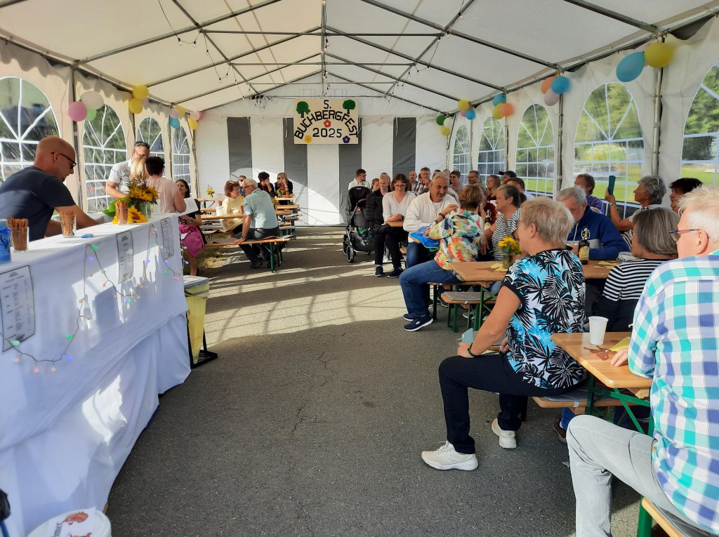 Rund 100 Einwohner mit Gästen, darunter Pfarrer Gunnar Peukert, waren gut gelaunt zum 5. Buchbergfest gekommen. Die jungen Familien Neumeister, Gradl und Lösche/Trütschler haben die Organisation und Durchführung des Festes von der früheren alten Generation übernommen und bravourös gelöst. Alle Einwohner begrüßten sie im liebevoll geschmückten Festzelt in einer lustigen, gereimten Vorstellungsrunde pro Haus. Ein eigenes, den Buchberg charakterisierendes vertontes Lied, hatte erfolgreich Premiere.